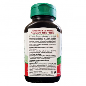 A Jamieson A+D3 vitamin étrend-kiegészítő lágy zselatin kapszula formájában érhető el, amely 10,000 IU A-vitamint és 800 IU D3-vitamint tartalmaz. Az A-vitamin hozzájárulhat a nyálkahártyák és a bőr normál állapotának fenntartásához, valamint a normál látás fenntartásához. A D-vitamin segíthet az egészséges csontozat és fogazat fenntartásában, valamint a kalcium és a foszfor normál felszívódásában és hasznosulásában. A termék nem tartalmaz keményítőt, glutént, laktózt, mesterséges színezékeket vagy ízesítőket, így különböző étrendi igényekhez is alkalmazkodhat.