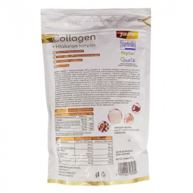 Hidrolizált kollagént tartalmaz! Nem tartalmaz mesterséges aromát és színezéket! Nem tartalmaz tartósítószert! A kollagén a bőrszövet egyik természetes alkotóeleme. A termékben található kollagén a Peptan 1-es típusú marha kollagén peptidből készül, amelyet a világ egyik vezető kollagén gyártó cége, a francia Rousselot gyárt. A Peptan kollagén egy nagy tisztaságú természetes kollagén. A hialuronsav az emberi szervezetben is előforduló, magas vízmegkötő tulajdonságokkal rendelkező poliszacharid, amely megtalálható többek között a bőrszövetben is. A C-vitamin hozzájárul a megfelelő kollagénképződéshez és ezen keresztül a bőr, a fogak, a csontozat, a porcok és a fogíny normál állapotának, működésének fenntartásához. A biotin és cink hozzájárul a bőr és a haj normál állapotának megőrzéséhez. A cink hozzájárul a normál csontozat és körmök fenntartásához. A D-vitamin hozzájárul az egészséges csontozat és izomfunkció, valamint a normál fogazat fenntartásához. A riboflavin (B2-vitamin) hozzájárul az idegrendszer normál működéséhez, a vörösvérsejtek és a bőr normál állapotának fenntartásához. A termék kizárólag szerves kötésű, jól hasznosuló cink-glükonátot tartalmaz. A cink-glükonátból származó szerves cink jobb hasznosulással rendelkezik, mint a szervetlen (cink-oxid) vegyületek.