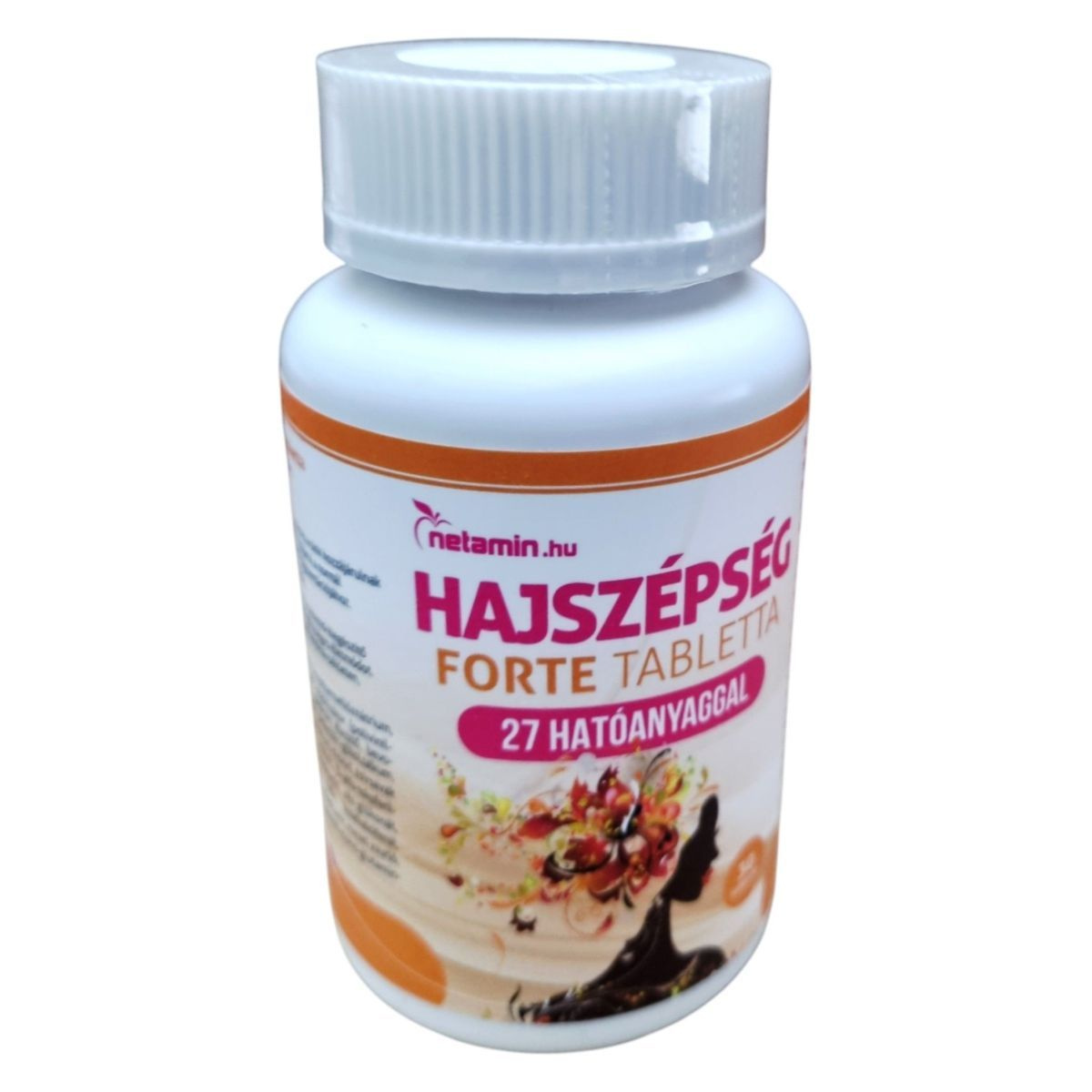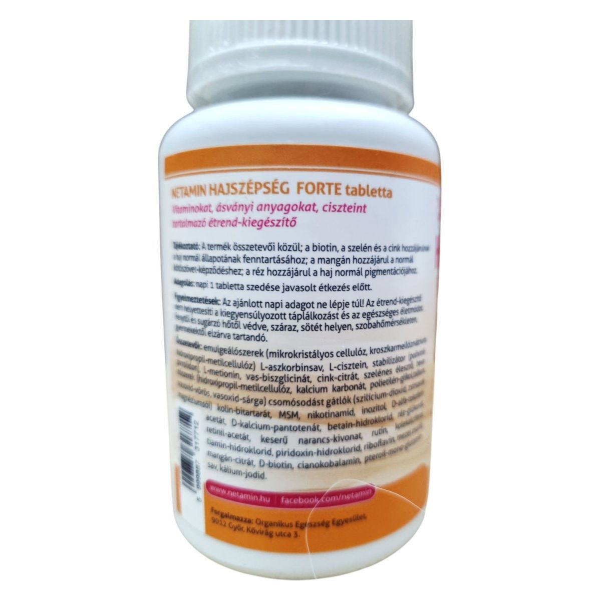 A Netamin Hajszépség Forte tabletta egy vitaminokat, ásványi anyagokat és ciszteint tartalmazó étrend-kiegészítő, amely 27 hatóanyagával hozzájárulhat a haj normál állapotának fenntartásához. A termék biotint, szelént és cinket tartalmaz, amelyek segíthetnek a haj egészségének megőrzésében. A mangán hozzájárulhat a normál kötőszövet-képződéshez, míg a réz támogathatja a haj normál pigmentációját. A tabletta bio étrendi irányzatot követ, és napi egy tabletta szedése javasolt étkezés előtt.
