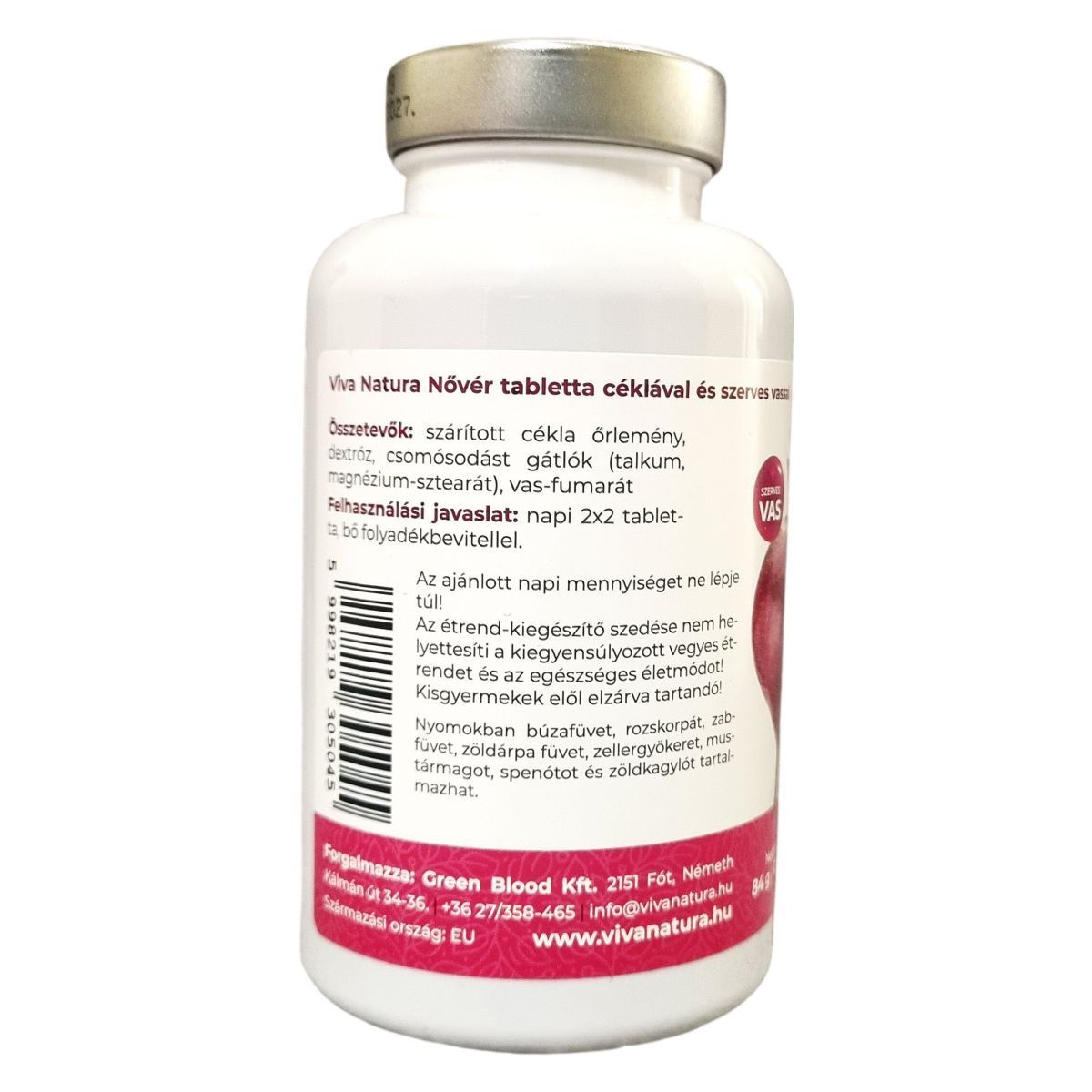 A Viva Natura Nővér tabletta céklával és szerves vassal a vas napi ajánlott mennyiségét biztosítja, amely szerepet játszik a hemoglobin előállításban és az oxigénszállításban is. A termék GMO-mentes, laktóz- és gluténmentes, valamint hozzáadott cukrot nem tartalmaz. Az étrend-kiegészítő összetevői között megtalálható a szárított cékla őrlemény és vas-fumarát, továbbá dextróz és csomósodást gátló anyagok (talkum, magnézium-sztearát). Az esetleges allergének jelenléte nyomokban előfordulhat. A termék megfelel a felnőttek számára ajánlott napi referenciaértékeknek, és alkalmas kiegészítője lehet a változatos étrendnek és az egészséges életmód támogatásának.