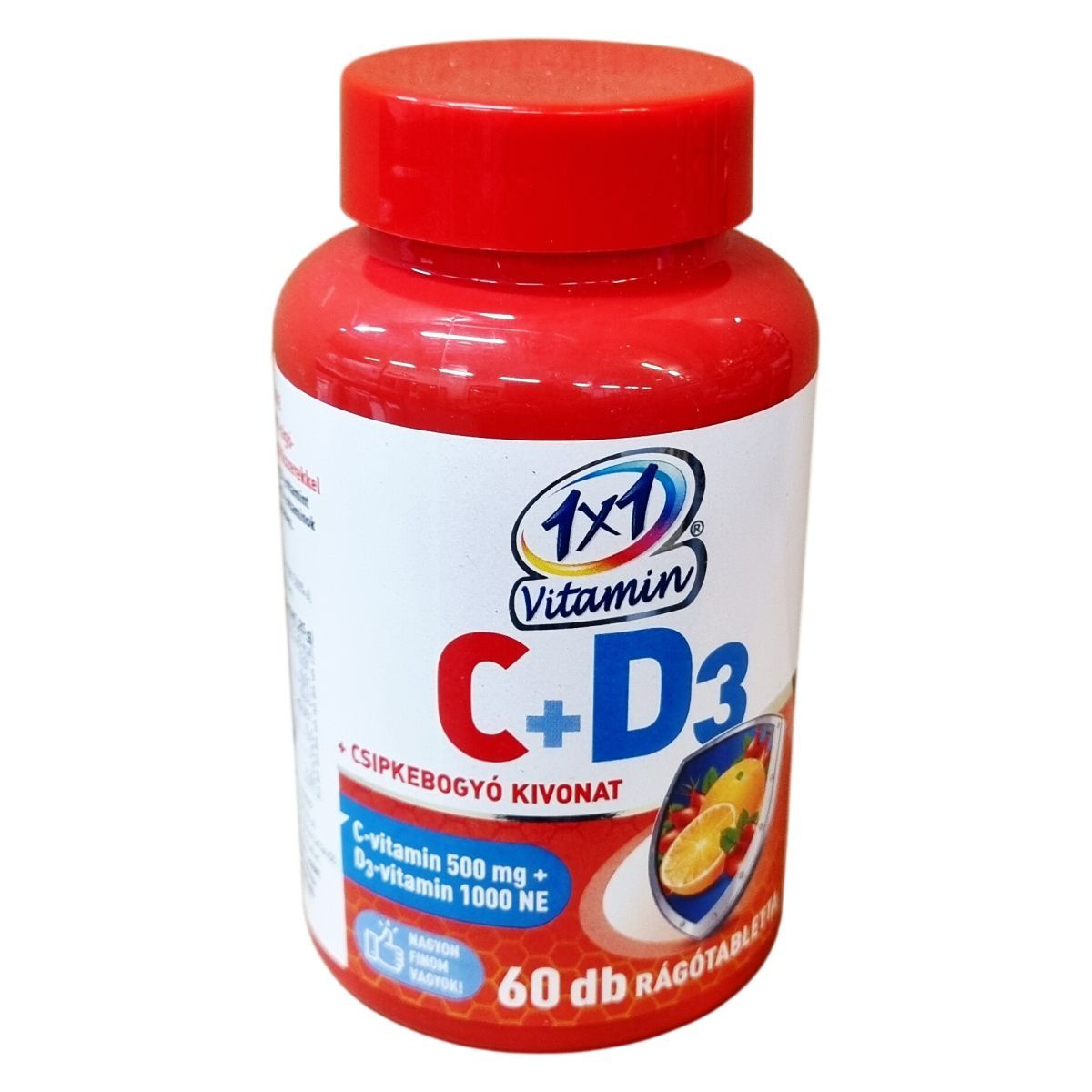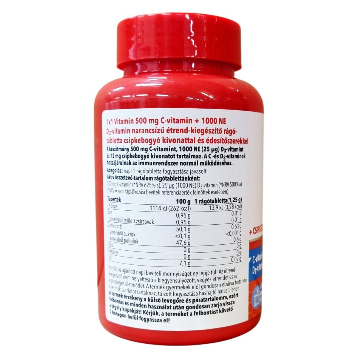 A 1x1 Vitamin C+ D3 + Csipkebogyó kivonat rágótabletta 500 mg C-vitamint, 1000 NE D3-vitamint (25 µg) és 12 mg csipkebogyó kivonatot tartalmaz tablettánként. A C- és D3-vitaminok hozzájárulhatnak az immunrendszer normál működéséhez. A készítmény narancsízű és édesítőszereket is tartalmaz, mint a szorbit, szukralóz és szacharin. A csomósodást gátló anyagok, stabilizátor és természetes aromák biztosítják a rágótabletta minőségét és ízét. A termék nettó tömege 75 g (60 db 1250 mg-os rágótabletta). Az EU-ban készült, az IP361392 jelzéssel ellátott étrend-kiegészítő táplálék-kiegészítőként alkalmazható, az ajánlott adag betartása mellett, kiegyensúlyozott étrend és egészséges életmód részeként.