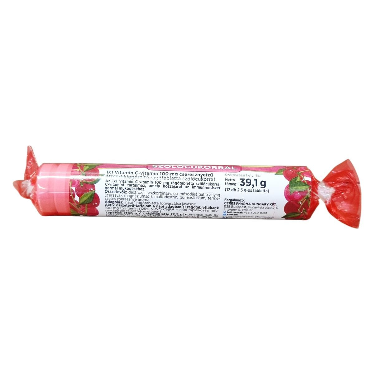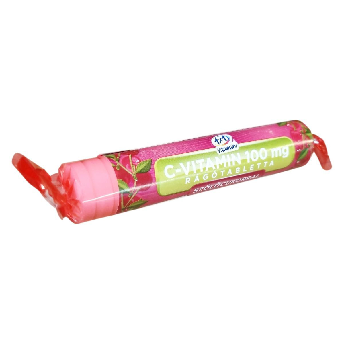 Az 1x1 Vitamin C-vitamin 100 mg rágótabletta szőlőcukorral cseresznye ízű étrend-kiegészítő, amely C-vitamint tartalmaz. A termék nettó tömege 39,1 g, ami 17 db 2,3 g-os tablettát foglal magában. Az egy tabletta napi ajánlott adagját 100 mg C-vitamin biztosítására állították össze, ami a felnőttek számára ajánlott napi táplálkozási referenciaérték 125%-a. A készítmény összetevői között megtalálhatóak a dextróz, L-aszkorbinsav, a csomósodást gátló anyag zsírsavak magnéziumsói formájában, maltodextrin, gumiarábikum és természetes cseresznye aroma. Tápértékadatok szerint 100 g termék energiatartalma 1539 KJ (362 kcal), amely egy tablettára vetítve 35,4 KJ (8,33 kcal). A zsír tartalma 0,95 g/0,02 g, ebből telített zsírsav 0,95 g/0,02 g. Szénhidrát 84,8 g/1,95 g, amelyből cukor 83,9 g/1,93 g. A termék nem tartalmaz poliolokat, rostot, fehérjét és sót. A csomagoláson feltüntetett minőségmegőrzési idő alatt javasolt a termék használata. A gyártás az Európai Unió területén történt.