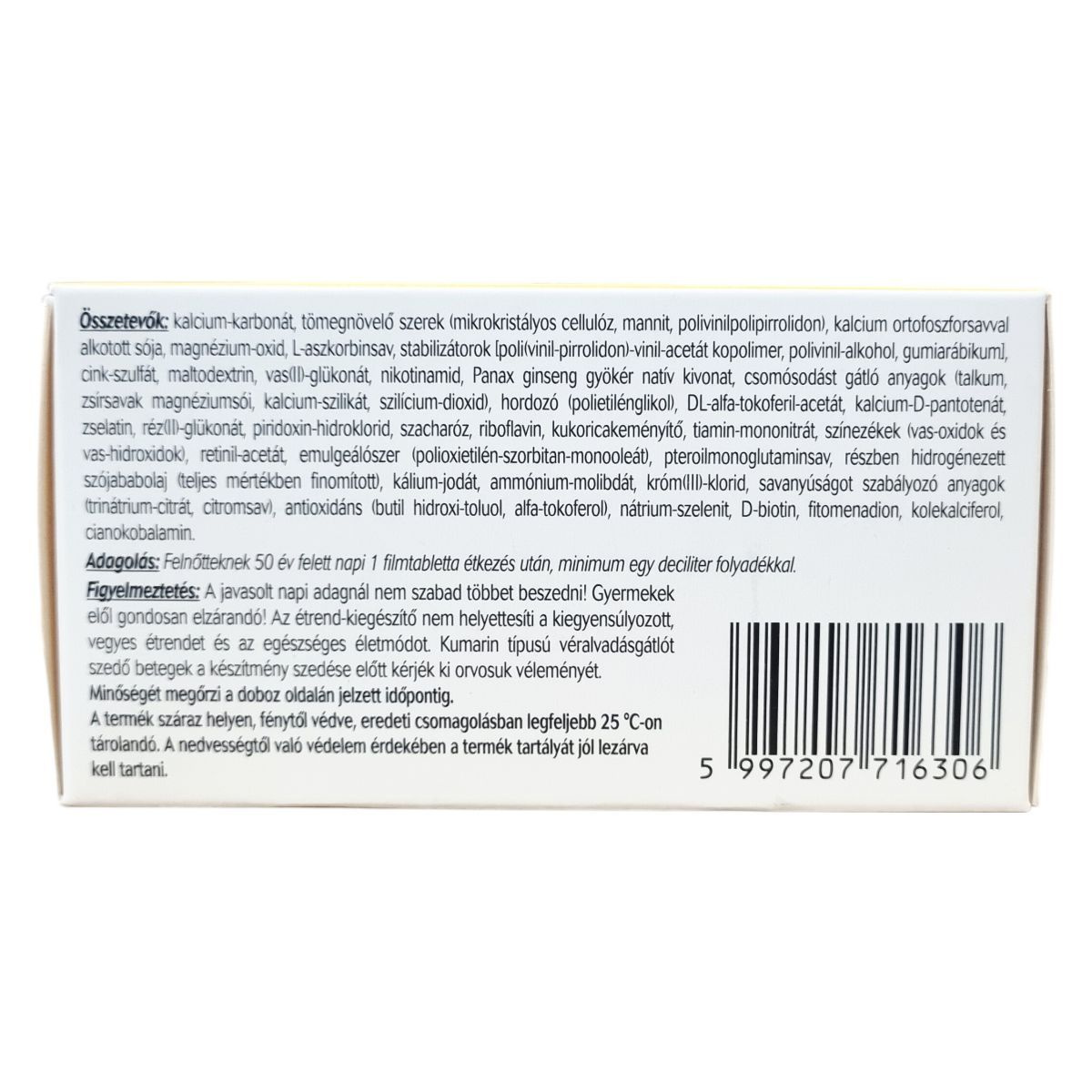 kalcium-karbonát, mikrokristályos cellulóz, mannit, polivinilpolipirrolidon, kalcium ortofoszforsavval alkotott sója, magnézium-oxid, L-aszkorbinsav, poli(vinil-pirrolidon)-vinil-acetát kopolimer, polivinil-alkohol, gumiarábikum, cink-szulfát, maltodextrin, vas(II)-glükonát, nikotinamid, Panax ginseng gyökér natív kivonat, talkum, zsírsavak magnéziumsói, kalcium-szilikát, szilícium-dioxid, polietilénglikol, DL-alfa-tokoferil-acetát, kalcium-D-pantotenát, zselatin, réz(II)-glükonát, piridoxin-hidroklorid, szacharóz, riboflavin, kukoricakeményítő, tiamin-mononitrát, vas-oxidok és vas-hidroxidok, retinil-acetát, polioxietilén-szorbitan-monooleát, pteroilmonoglutaminsav, részben hidrogénezett szójababolaj, kálium-jodát, ammónium-molibdát, króm(III)-klorid, trinátrium-citrát, citromsav, butil hidroxi-toluol, alfa-tokoferol, nátrium-szelenit, D-biotin, fitomenadion, kolekalciferol, cianokobalamin