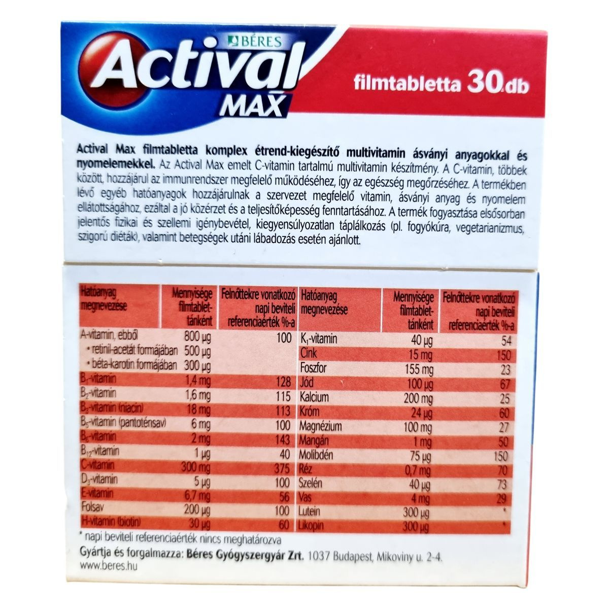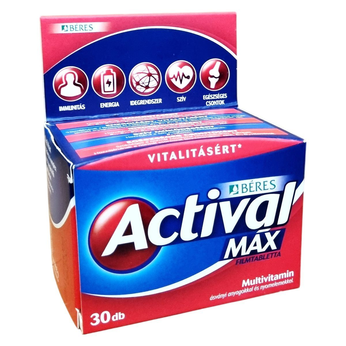 Az Actival Max filmtabletta egy komplex étrend-kiegészítő, amely multivitaminokat, ásványi anyagokat és nyomelemeket tartalmaz. A termék emelt C-vitamin tartalmú, amely hozzájárulhat az immunrendszer megfelelő működéséhez. A termék fogyasztása elsősorban jelentős fizikai és szellemi igénybevétel, kiegyensúlyozatlan táplálkozás, valamint betegségek utáni lábadozás esetén ajánlott. A készítmény összetevői hozzájárulhatnak a szervezet megfelelő vitamin, ásványi anyag és nyomelem ellátottságához, ezáltal támogathatják a jó közérzet és a teljesítőképesség fenntartását.