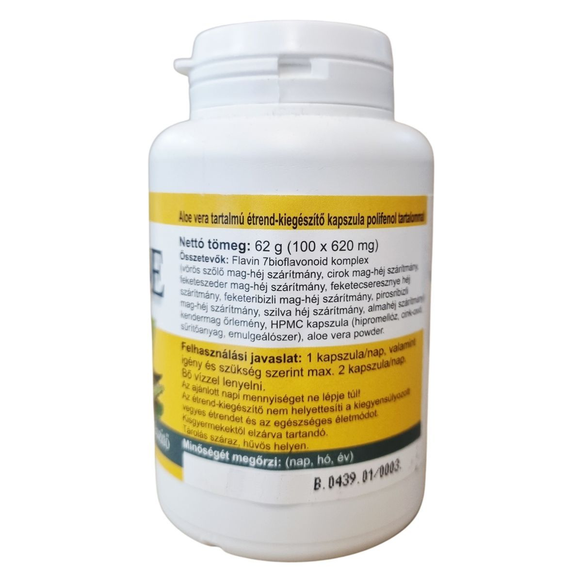 A VITA CRYSTAL RESEARCH ALOE kapszula egy 100 darabos kiszerelésű étrend-kiegészítő, amely összetett bioflavonoid komplexből és aloe vera porból áll. A Flavin 7 bioflavonoid komplex többféle gyümölcshéj és mag szárítmányát tartalmazza, emellett kendermag őrleményt és növényi alapú kapszulát használ. A termék az ajánlott adagban aloe vera szárított port, összes polifenolt, flavonoidokat és resveratrolt biztosít, amelyek hozzájárulhatnak az antioxidáns hatások támogatásához. Felhasználáskor 1 kapszula ajánlott napi bevitelként, szükség esetén maximum 2 kapszula. A kapszulákat bő vízzel kell lenyelni, és a terméket kisgyermekektől el kell zárni, továbbá fontos, hogy az étrend-kiegészítőt ne tekintsük a kiegyensúlyozott étrend vagy az egészséges életmód helyettesítőjének. A termék száraz, hűvös helyen tárolandó.