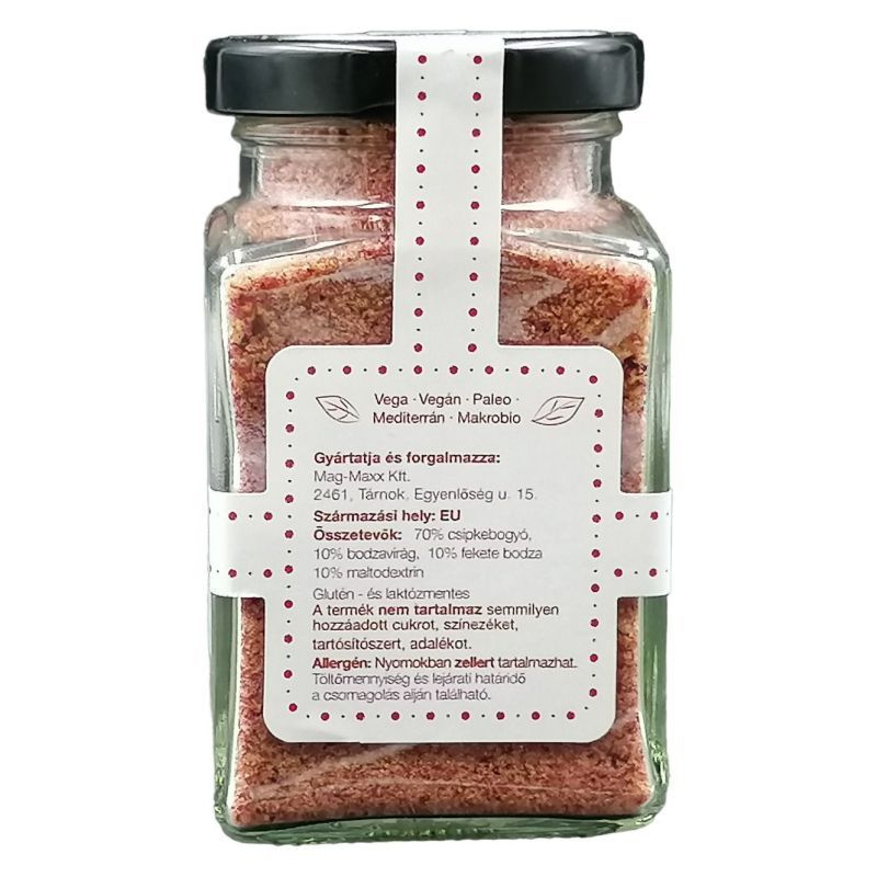 70% csipkebogyó, 10% bodzavirág, 10% fekete bodza, 10% maltodextrin