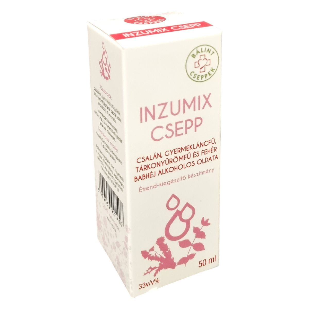 Az Inzumix csepp egy alkoholos oldat csalánlevélből, gyermekláncfű gyökérből, tárkonyürömfűből és fehér babhéjból. A termékben előfordulhat üledékesség, amely nem befolyásolja a minőségét. Nettó térfogata 50 ml, származási helye Magyarország.