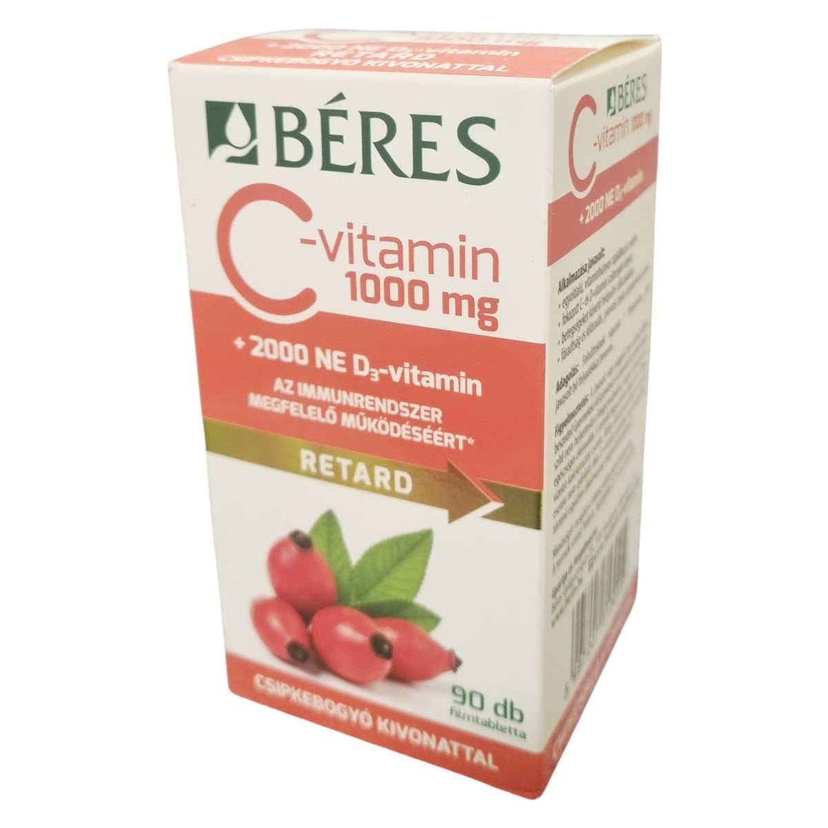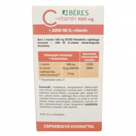 A Béres C-vitamin 1000 mg + 2000 NE D3-vitamin retard filmtabletta csipkebogyó kivonattal étrend-kiegészítő készítmény, melynek egy filmtablettája 1000 mg C-vitamint, 50 µg (2000 NE) D3-vitamint és 25 mg csipkebogyó száraz kivonatot tartalmaz, utóbbi 2:1 drog:extraktum arányban. A C-vitamin hozzájárulhat az immunrendszer és az idegrendszer megfelelő működéséhez, a fáradtság és a kifáradás csökkentéséhez, továbbá a normál energiatermelő anyagcsere-folyamatokhoz. Emellett antioxidáns hatású anyagként a sejtek oxidatív stresszel szembeni védelmét támogathatja. A D-vitamin az immunrendszer normál működésében és az egészséges izomfunkció fenntartásában játszhat szerepet, valamint részt vehet a sejtosztódás folyamatában. A termék ellenőrzött alapanyagokból és rendszeresen ellenőrzött hatóanyag-tartalommal készül, hazai fejlesztésű készítményként. Alkalmazása javasolt többek között egyoldalú, vitaminhiányos táplálkozás esetén, fokozott vitamin-szükséglet idején, betegségeket követő felépülés során, valamint fáradtság és jelentős fizikai igénybevétel időszakában.