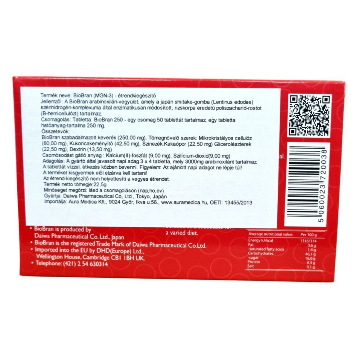 A BioBran (MGN-3) étrendkiegészítő egy különleges arabinoxilán-vegyület, amely a japán shiitake-gomba szénhidrát-komplexuma által enzimatikusan módosított rizskorpa eredetű poliszacharid-rostot tartalmazhat. A termék GMO-mentes, és napi adagja 3000 mg arabinoxilánt biztosíthat. A tablettákat vízzel, étkezés közben ajánlott bevenni. A termék energia- és tápértékei 100 g-ra vonatkoztatva: 1316 kJ/314 kcal energia, 5.6 g zsír, amelyből 1.6 g telített zsírsav, 16.9 g szénhidrát, amelyből 16.0 g cukor, 6.4 g fehérje és 0.1 g só. A terméket a Daiwa Pharmaceutical Co. Ltd. gyártja, és az Aura Medica Kft. importálja Magyarországra. Fontos figyelmeztetés, hogy az étrend-kiegészítő nem helyettesíti a vegyes étrendet, és kisgyermekek elől elzárva tartandó.