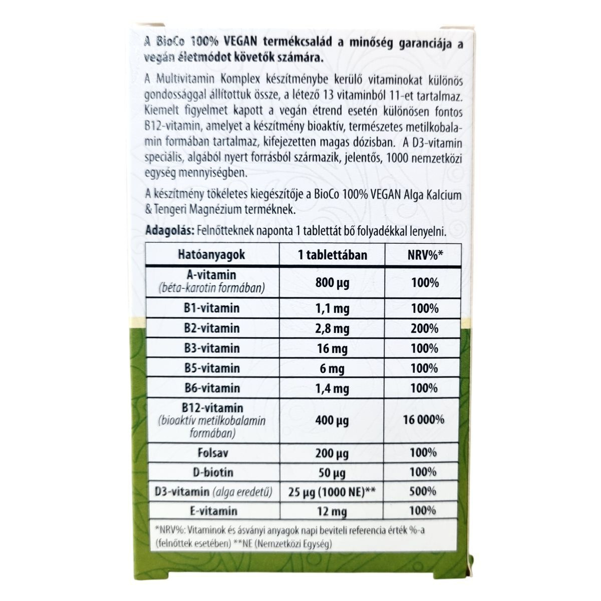 A BioCo 100% VEGAN Multivitamin Komplex készítmény a vegán életmódot követők számára készült. A termék a létező 13 vitaminból 11-et tartalmaz, kiemelten magas dózisban bioaktív, természetes metilkobalamin formájú B12-vitaminnal, valamint algából nyert D3-vitaminnal. A készítmény tökéletes kiegészítője a BioCo 100% VEGAN Alga Kalcium & Tengeri Magnézium terméknek. Magyar fejlesztésű és gyártású termék, ISO 22000 és Jó Gyártási Gyakorlat (GMP) szerint tanúsított élelmiszerbiztonsági rendszerben készül.