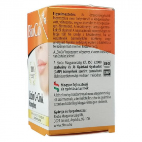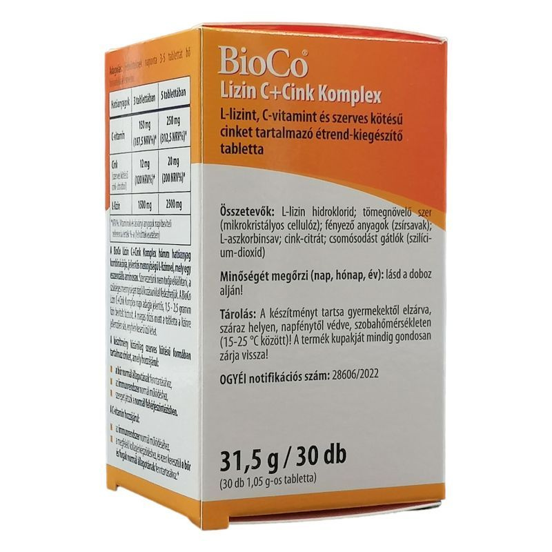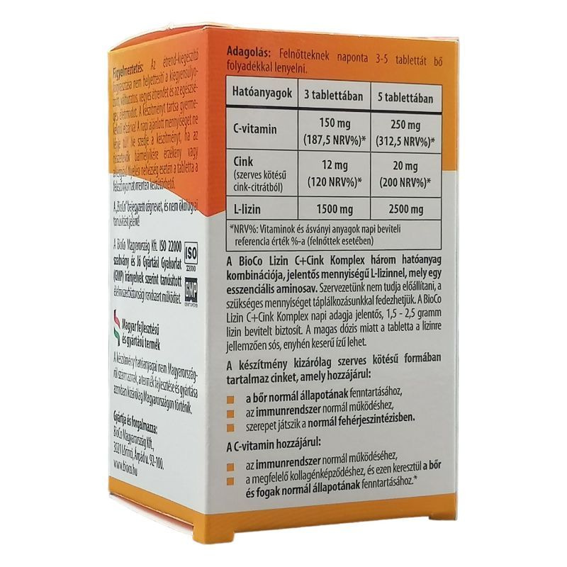 A BioCo Lizin C+Cink Komplex három hatóanyag kombinációja, jelentős mennyiségű L-lizinnel, mely egy esszenciális aminosav. Szervezetünk nem tudja előállítani, a szükséges mennyiséget táplálkozásunkkal fedezhetjük. A BioCo Lizin C+Cink Komplex napi adagja jelentős, 1,5 - 2,5 gramm lizin bevitelt biztosít. A magas dózis miatt a tabletta a lizinre jellemzően sós, enyhén keserű ízű lehet.