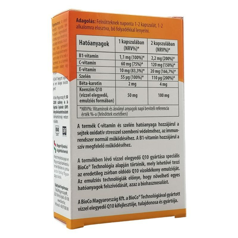 Az emulziós technológiák előnye, hogy növelheti egyes hatóanyagok felszívódását, azaz a biohasznosulást. A BioCo Magyarország Kft. a BioCo Technológiával gyártott vízzel elegyedő Q10 kifejlesztője, tulajdonosa és gyártója. Adagolás: naponta 1-2 kapszulát, 1-2 alkalomra elosztva, bő folyadékkal lenyelni. Hatóanyagok 1 kapszulában: Vízzel elegyedő Koenzim Q10: 50 mg, B1-vitamin: 1,1 mg (100%)*, C-vitamin: 60 mg (75 NRV%)*, E-vitamin: 10 mg (83,3 NRV%)*, Béta-karotin: 2 mg, Szelén: 55 µg (90,9 NRV%)* *NRV%: napi beviteli referencia érték %-a felnőttek esetében.