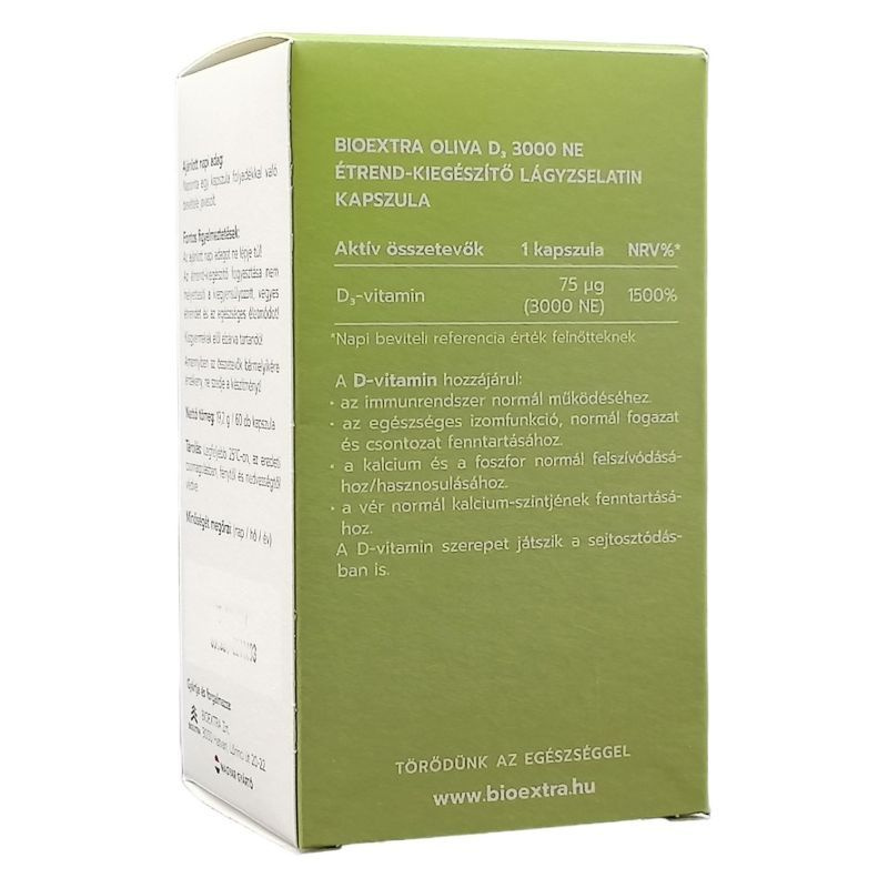 Az olíva D3-vitamin olyan étrend-kiegészítő forma, amelyben a zsírban oldódó D3-vitamin (kolekalciferol) olívaolajban oldva kerül alkalmazásra a jobb felszívódás érdekében. A D3-vitamin prohormon jellegű vegyület, amely a szervezetben aktív kalcitriollá alakul, és a kalcium- valamint foszfát-anyagcsere szabályozásában játszik szerepet. Hozzájárulhat a normál csontozat, izomműködés és immunrendszeri funkció fenntartásához. Az olívaolaj mint vivőanyag elősegítheti a zsírban oldódó vitamin felszívódását a bélrendszerben. Megfelelő adagolás mellett általában biztonságos, azonban túlzott bevitel esetén hiperkalcémia alakulhat ki. Egyéni egészségügyi állapot vagy gyógyszerszedés esetén javasolt szakemberrel konzultálni.