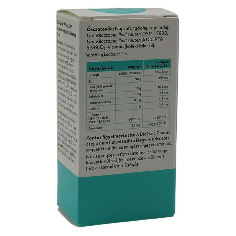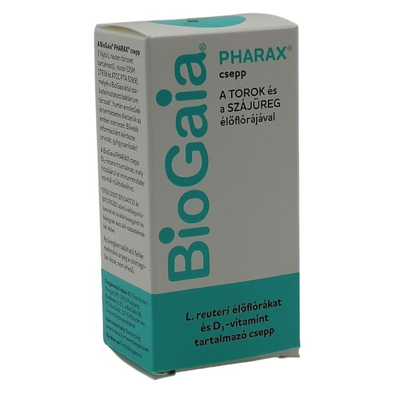 A BioGaia PHARAX csepp kétfajta L. reuteri törzset (L. reuteri DSM 17938 és ATCC PTA 5289) tartalmaz, melyek a BioGaia által szabadalmaztatott baktériumtörzsek, humán eredetűek, és természetes életterük az emberi szervezet. Emellett a BioGaia PHARAX️ csepp D₃-vitamint tartalmaz, mely hozzájárul az immunrendszer egészséges működéséhez. Adagolás: