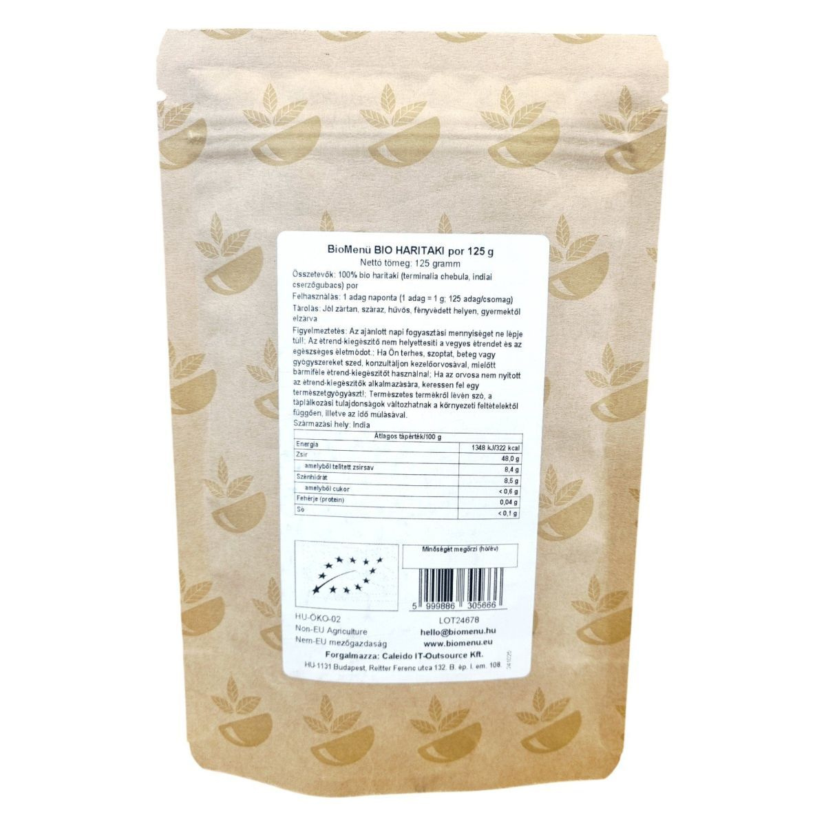 A BioMenü BIO HARITAKI por 125 g kiszerelésben kapható, és 100% bio haritaki port tartalmaz, amelyet Terminalia chebula, más néven indiai cserzőgubacs növényből nyernek. A termék Indiából származik, és megfelel a bio, raw és vegán étrendi irányzatoknak. A haritaki por felhasználása napi egy gramm, amely 125 adagot biztosít csomagonként. A termék tárolása jól zártan, száraz, hűvös és fényvédett helyen javasolt, gyermekektől elzárva. A termék forgalmazója a Caleido IT-Outsource Kft., és rendelkezik HU-ÖKO-02 tanúsítvánnyal, amely igazolja a bio minőséget.