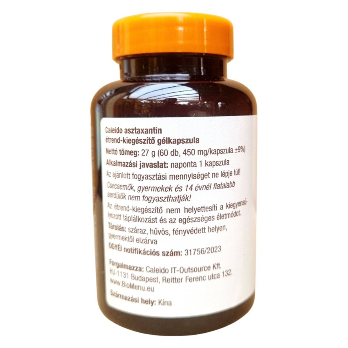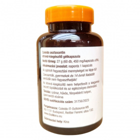 A Caleido Asztaxantin kapszula egy étrend-kiegészítő, amely 60 gélkapszulát tartalmaz, összesen 27 g nettó tömeggel. Az asztaxantin egy antioxidáns, amely hozzájárulhat a sejtek védelméhez. A termék asztaxantinolaj szuszpenziót tartalmaz, amelynek 10%-a asztaxantin. A kapszulák szarvasmarha zselatinból készülnek, és szójaolajat is tartalmaznak. A termék Kínából származik, és a Caleido IT-Outsource Kft. forgalmazza Magyarországon. A termék használata során fontos betartani az ajánlott napi mennyiséget, és figyelembe venni, hogy nem helyettesíti a kiegyensúlyozott étrendet.