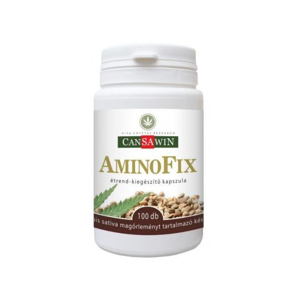 CanSaWin AminoFix (1 kapszula (617 mg)), számított anyag összetétele: kapszula héj: hipromellóz, gellángumi: 114,6 mg, kendermag szárított őrlemény: 100 mg, L-lizin: 87,5 mg, L-glutamin: 80 mg, L-leucin: 55 mg, L-triptofán: 45 mg, L-arginin: 30 mg, L-valin: 27,5 mg, L-isoleucin: 27,5 mg, koenzim Q10: 25 mg, Flavin7 bioflavonoid complex (vörös szőlő mag-héj-, cirok mag- héj-, feketeszeder mag-héj-, feketecseresznye héj-, feketeribizli mag-héj-, pirosribizli mag-héj-, szilva héj-, almahéj szárított őrleményei): 20 mg, NADH: 2,5 mg, színezék: titán-dioxid: 2,4 mg.