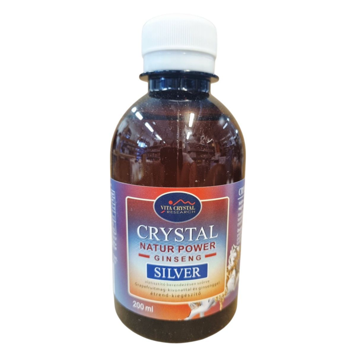 A CRYSTAL NATUR POWER GINSENG SILVER egy speciális étrend-kiegészítő, amely grapefruitmag- és ginzeng-kivonatot tartalmaz. A termék víztisztító berendezésen szűrt, reverse ozmossal tisztított víz alapú, amely ezüstözött aktív szén töltettel van ellátva. A grapefruitmag-kivonat citrus bioflavonoidokat tartalmazhat, amelyek antioxidáns hatásúak lehetnek, míg a ginzeng-kivonat ginsenoside-okat tartalmazhat, amelyek hozzájárulhatnak az energiaszint fenntartásához. A termék 200 ml-es kiszerelésben kapható, és javasolt napi fogyasztása 20-50 ml. Fontos, hogy az ajánlott napi mennyiséget ne lépje túl, és a termék nem helyettesíti a kiegyensúlyozott étrendet és az egészséges életmódot.