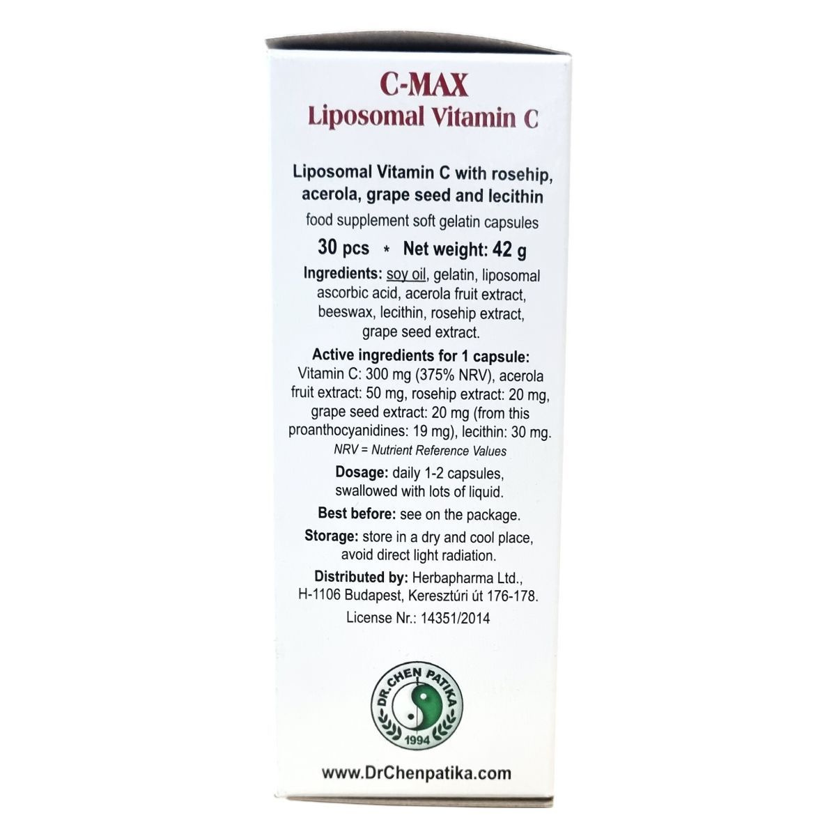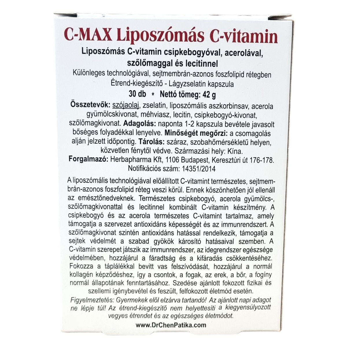 A C MAX Liposzómás C-vitamin különleges technológiával készül, amelynek eredményeként a C-vitamint természetes, sejtmembránnal azonos foszfolipid réteg veszi körül, így ellenállóvá válik az emésztőnedvekkel szemben. A készítmény természetes csipkebogyó-, acerola- és szőlőmagkivonatot, valamint lecitint tartalmaz. A csipkebogyó és az acerola természetes C-vitamin források, amelyek hozzájárulhatnak a szervezet antioxidáns védelméhez és az immunrendszer támogatásához. A szőlőmagkivonat antioxidáns hatású komponenseivel a sejtek védelmét segítheti a szabad gyökök károsító hatásaival szemben. A C-vitamin szerepet játszhat az immunrendszer és az idegrendszer egészségének védelmében, valamint hozzájárulhat a fáradtság csökkentéséhez és a vas felszívódásának fokozásához. A kollagén képződés támogatása által hozzájárulhat a csontok, a fogak, az erek, a bőr és a fogíny normál állapotának fenntartásához. A készítmény szedése javasolt fokozott fizikai és szellemi igénybevétel, valamint feszült életmód esetén.