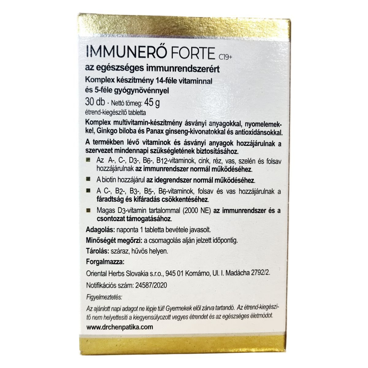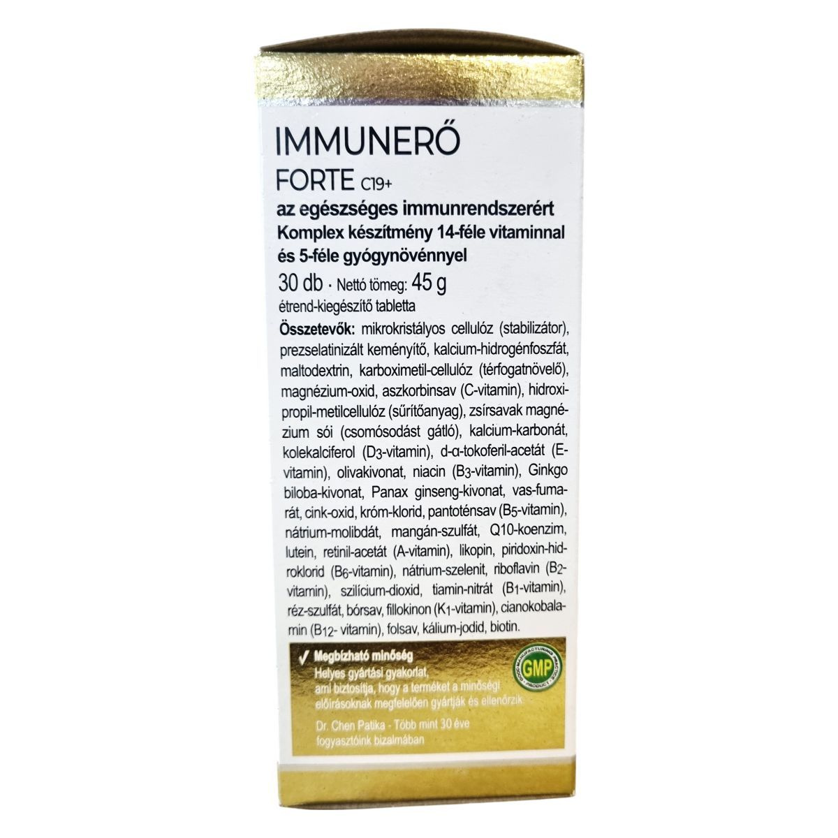 Az IMMUNERŐ FORTE C19+ egy komplex multivitamin-készítmény, amely 14-féle vitamint, ásványi anyagot, nyomelemet, valamint 5-féle gyógynövényt tartalmaz. Fő összetevői között megtalálhatóak az immunrendszer normál működését támogató A-, C-, D3-, B6-, B12-vitaminok, cink, réz, vas, szelén és folsav. A biotin az idegrendszer normál működéséhez járulhat hozzá, míg a C-, B2-, B3-, B5-, B6-vitaminok, folsav és vas csökkentheti a fáradtságot és kifáradást. A termékben magas D3-vitamin-tartalom található, amely 2000 NE adagban segítheti az immunrendszer és a csontozat támogatását. Az immunerőt komplex módon erősíthetik a Ginkgo biloba- és Panax ginseng-kivonatok, a lutein, likopin, olíva polifenol és Q10-koenzim antioxidáns együttese. A készítmény helyes gyártási gyakorlat szerint készül, amely biztosítja a minőségi előírásoknak való megfelelést. Naponta 1 tabletta fogyasztása ajánlott az optimális hatás érdekében.