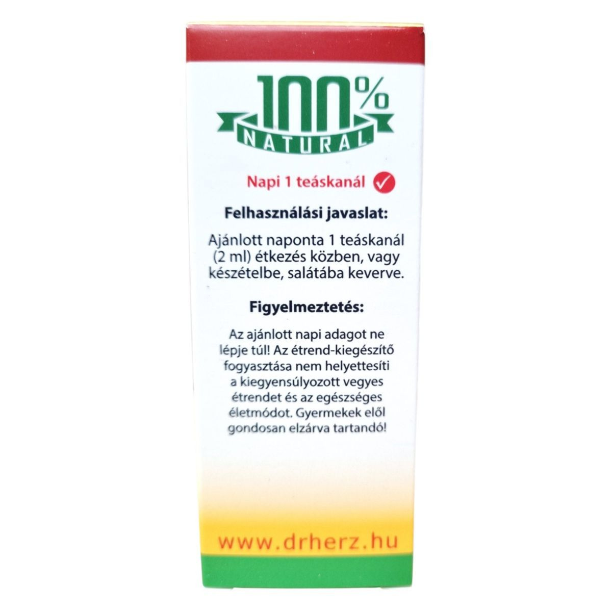 A Dr. Herz 100% Hidegen Sajtolt Homoktövis Magolaj egy természetes étrend-kiegészítő, amely hidegen sajtolt homoktövis magolajat tartalmaz. A termék napi adagja 2 ml, amelyet étkezés közben vagy salátába keverve ajánlott fogyasztani. Az olaj omega-3 és omega-6 zsírsavakat tartalmazhat, amelyek hozzájárulhatnak az egészséges életmód támogatásához. A terméket hűvös helyen, fénytől védve kell tárolni, és fontos, hogy az ajánlott napi adagot ne lépjük túl. Az étrend-kiegészítő nem helyettesíti a kiegyensúlyozott étrendet és az egészséges életmódot.