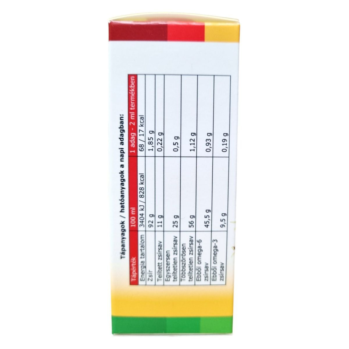 Zsír 92 g, ebből telített zsírsav 11 g, egyszeresen telítetlen zsírsav 25 g, többszörösen telítetlen zsírsav 56 g