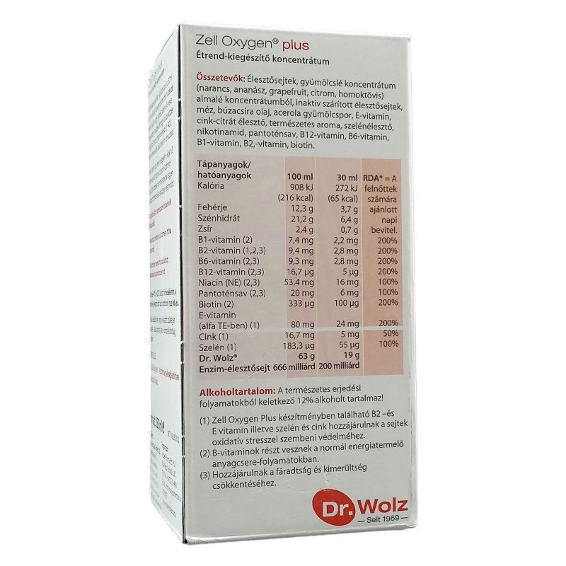 Annak érdekében, hogy az egyes anyagok vitalizáló és antioxidáns hatásukat célzottan, a sejtek szintjén tudják kifejteni, az anyagok szinergikus formában vannak jelen, azaz közös hatásuk nagyobb, mint az egyes hatások külön-külön. Egy evőkanál (10 ml) 66 milliárd Dr. Wolz Enzim-élesztősejtet tartalmaz. A Dr. Wolz Zell Oxygen Plus készítmény természetes alkotórészeinek átfogó kínálatából a szervezet pontosan azokat a tápanyagokat tudja felvenni, amelyek neki hiányoznak. A létfontosságú tápanyagokat tartalmazó Dr. Wolz Enzim-élesztősejteket, természetes úton juttatjuk a szervezetbe. Fogyasszunk minden nap egy kis pohárral az értékes enzimek gazdagságából, a sejteket ellátó és védő anyagokból, amelyek így támogatják a testi funkciókat: Védik sejtjeinket az oxidatív terheléstől, a szabad gyököktől, és támogatják a sejtek energia-anyagcseréjét. A készítmény nem tartalmaz glutént, laktózt zselatint, színezéket és tartósítószereket. A készítmény a természetes erjedési folyamatokból keletkező 12% alkoholt tartalmaz! Gyermekek, várandósok, szoptatós anyák és alkoholbetegek nem fogyaszthatják! Összetevők: Enzim-tartalmú élesztősejtek, gyümölcslé koncentrátum (narancs, ananász, grapefruit, citrom, homoktövis) almalé koncentrátumból, inaktív szárított élesztősejtek, méz, búzacsíra olaj, acerola gyümölcspor, E-vitamin, cinkélesztő, természetes aroma, szelénélesztő, nikotinamid, pantothenat, B12-vitamin, B6-vitamin, B1-vitamin, B2,-vitamin, biotin. Alkalmazási javallat: Ajánlott naponta 10 - 30 ml (1 - 3 teli evőkanál) koncentrátumot hígítva tetszés szerint italban vagy gyümölcslében elkeverve elfogyasztani étkezés előtt vagy étkezés közben (a legjobb ízhatás almalével érhető el), +40°C feletti hőmérsékletű itallal bevenni nem szabad. Használat előtt jól felrázandó! Felbontást követően hűtve tárolandó!