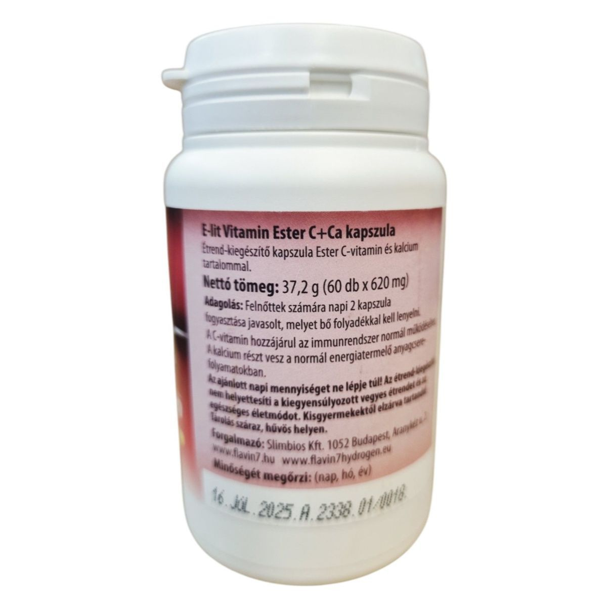 Az E-lit Vitamin Ester C+Ca kapszula egy étrend-kiegészítő, amely Ester C-vitamint és kalciumot tartalmaz. A C-vitamin hozzájárulhat az immunrendszer normál működéséhez, míg a kalcium részt vehet a normál energiatermelő anyagcsere-folyamatokban. A termék 60 kapszulát tartalmaz, és felnőttek számára napi 2 kapszula fogyasztása javasolt. Az összetevők között található a Flavin 7 Prémium komplex, amely különböző gyümölcsök és zöldségek szárítmányait tartalmazza. A termék tárolása száraz, hűvös helyen ajánlott, és fontos, hogy az ajánlott napi mennyiséget ne lépjük túl.