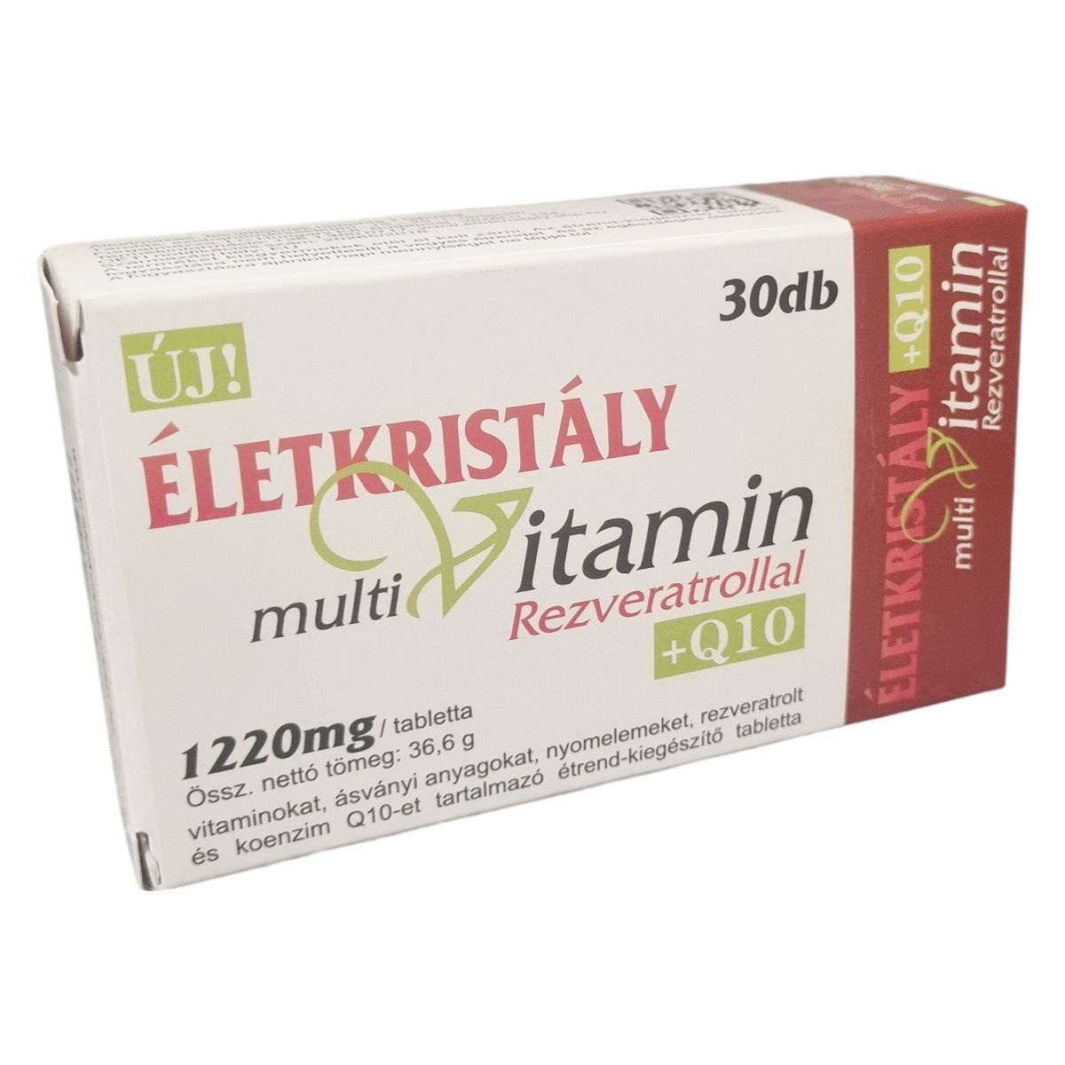 Az ÉLETKRISTÁLY multi vitamin Rezveratrollal +Q10 egy komplex étrend-kiegészítő tabletta, amely vitaminokat, ásványi anyagokat, nyomelemeket, valamint rezveratrolt és koenzim Q10-et tartalmaz. Egy tabletta nettó tömege 1220 mg, és a csomag 30 darabot tartalmaz. A termék származási helye az Európai Unió. Az ajánlott felhasználás szerint felnőtteknek naponta egy tablettát kell fogyasztani. A termék a tárolási ajánlásokat figyelembe véve szobahőmérsékleten, 15-25 °C között tartható. Az összetételében megtalálhatóak többek között B-vitaminok, C-, E-, A-, D3- és K1-vitaminok, valamint fontos ásványi anyagok, mint a kalcium, magnézium, cink, vas, mangán, bór, réz, jód, króm, szelén és molibdén. Különleges összetevők között szerepel a rezveratrol, likopén, lutein és koenzim Q10. A termék nem helyettesíti a kiegyensúlyozott étrendet és az egészséges életmódot, valamint kisgyermekek elől elzárva kell tartani. Forgalmazója az LC Hungary Kft., amely biztosítja a termék elérhetőségét Magyarországon.
