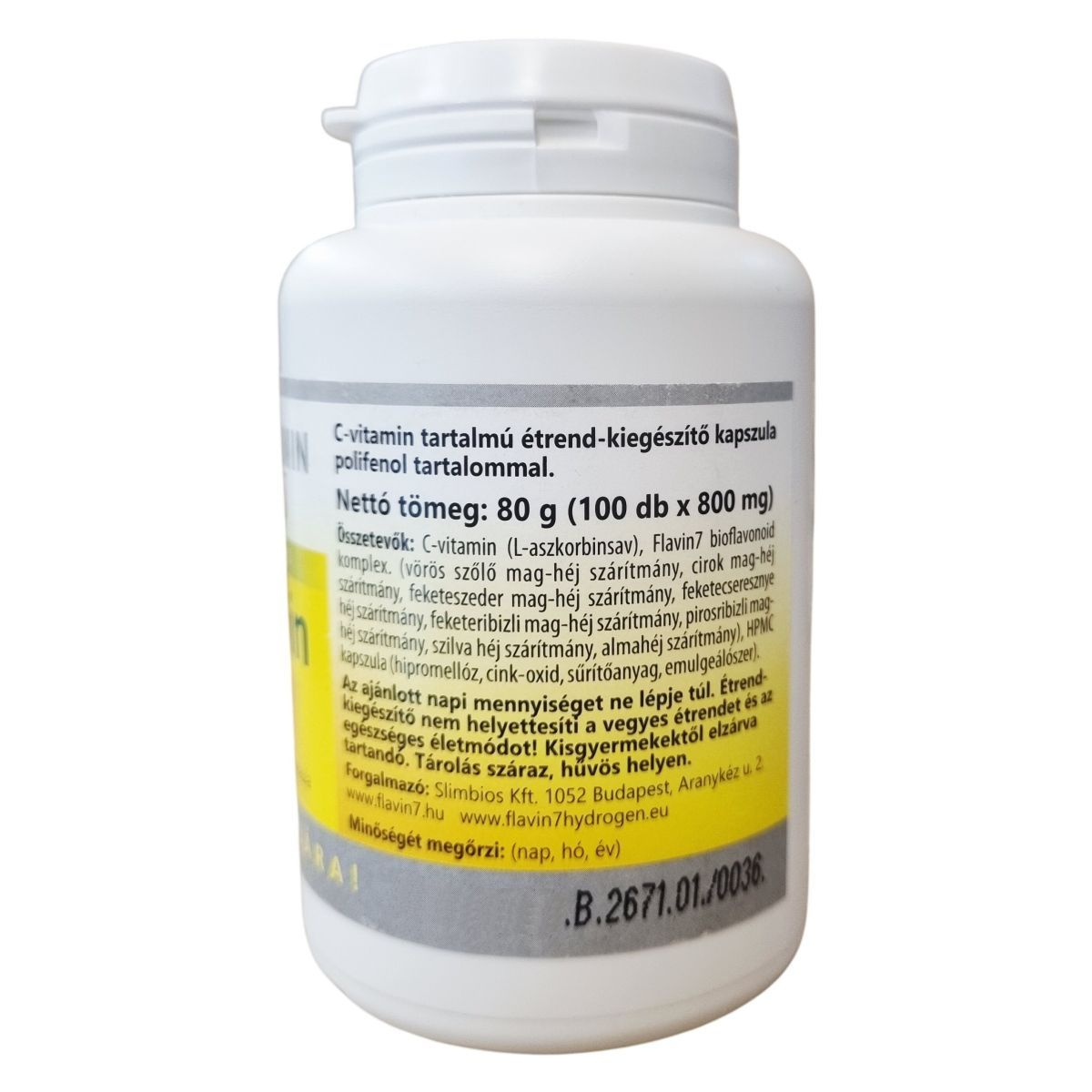 C-vitamin (L-aszkorbinsav), Flavin7 bioflavonoid komplex (vörös szőlő mag-héj szárítmány, cirok mag-héj szárítmány, feketeszeder mag-héj szárítmány, feketecseresznye héjszárítmány, feketeribizli mag-héj szárítmány, pirosribizli mag-héj szárítmány, szilva héj szárítmány, almahéj szárítmány), HPMC kapszula (hipromellóz, cink-oxid, sűrítőanyag, emulgeálószer).