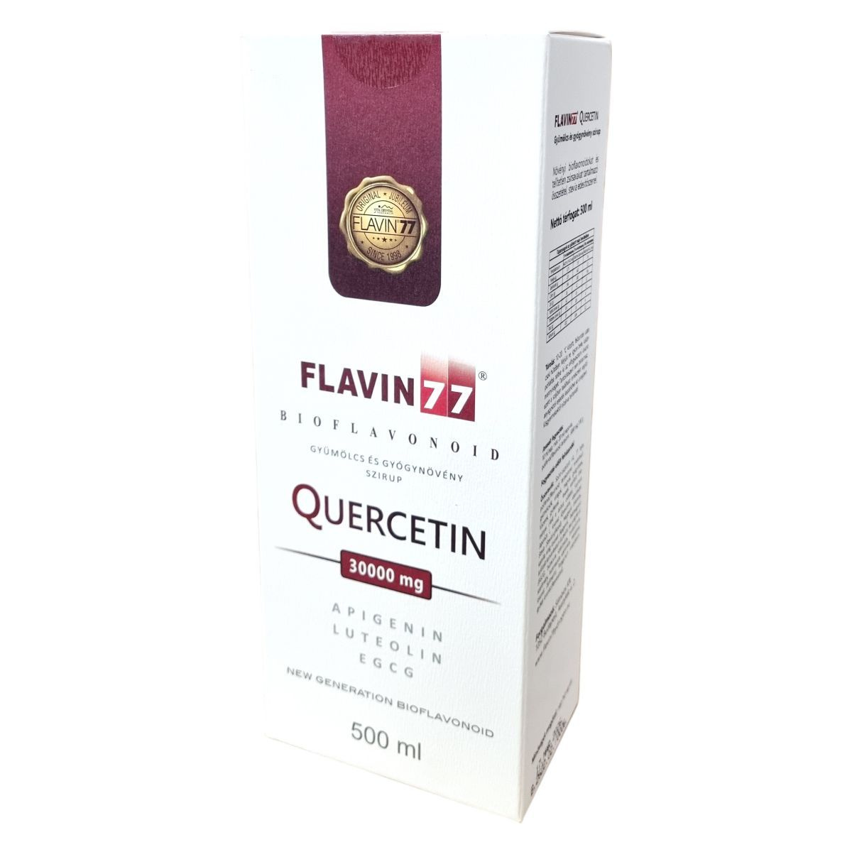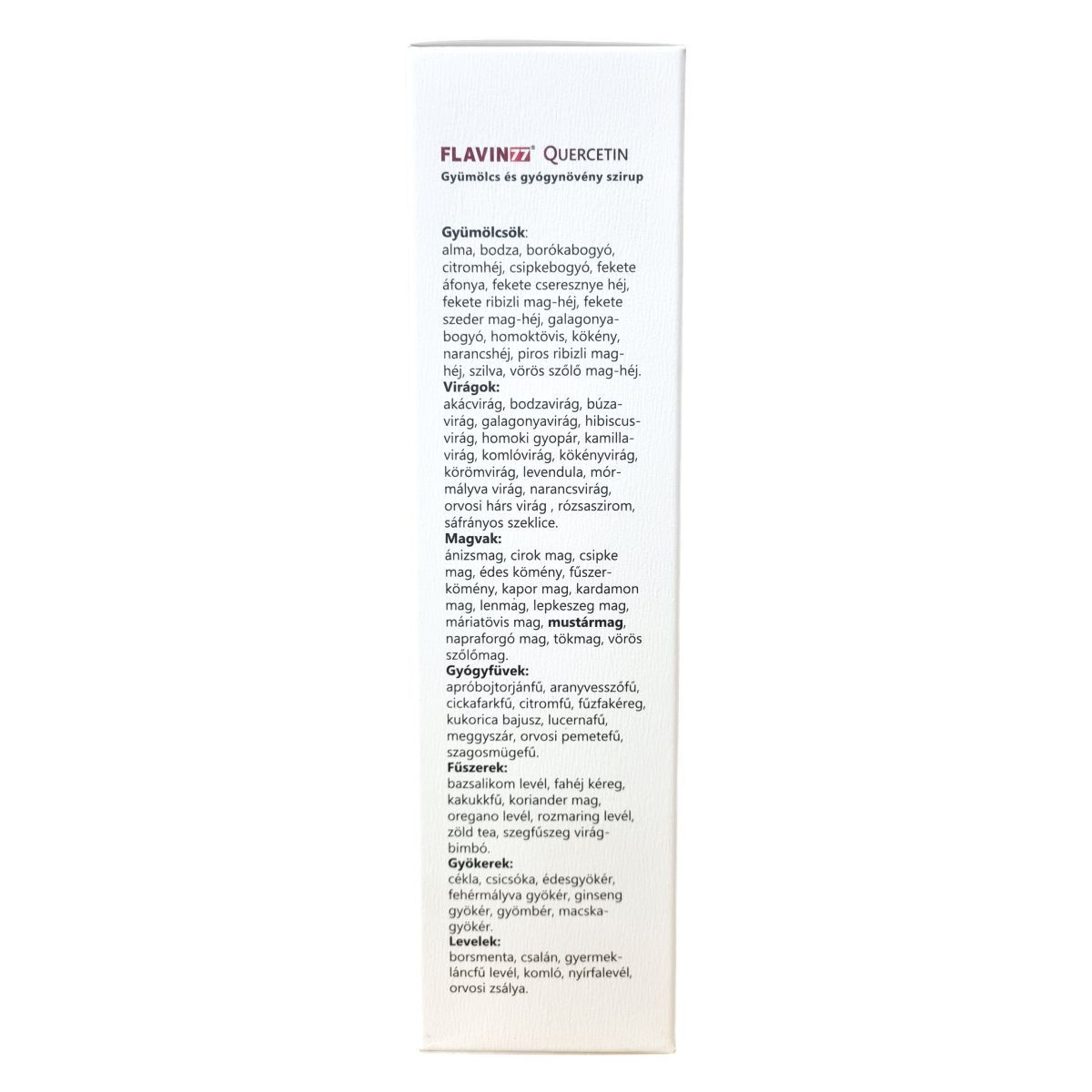 A Flavin77® Quercetin gyümölcs és gyógynövény szirup egy egyedülálló növényi bioflavonoid és polifenol forrás, amely 77 különböző gyümölcs, virág, mag, gyógynövény, fűszer, gyökér és levél szárított őrleményét tartalmazza. Fő hatóanyagai közé tartozik a quercetin, apigenin, luteolin és az EGCG. A termék stevia alapú édesítőszerrel készült, tartósítószert nem tartalmaz és polifenol/flavonoid tartalma 6000 mg/100 g. A készítmény gazdag a természetes összetevők széles palettájában, mint például alma, bodza, fekete áfonya, kamilla, máriatövis, gyömbér, zöld tea és sok egyéb, melyek mind hozzájárulhatnak a szervezet támogatásához. A termék használata előtt felrázandó, ajánlott napi adagja 10-20 ml. A szirup mint telítetlen zsírsavakban is gazdag, ezáltal komplex támogatást nyújthat az egészséges táplálkozás részeként.