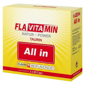 Most egy olyan hatóanyag-együttest készítettünk, mely minden olyan összetevőt tartalmaz azon vitaminokból, ásványi-anyagokból, flavonoidokból és aminosavakból, amelyekre a szervezetünknek napi szinten szüksége van. A Flavitamin All in készítményt azon egészségtudatos vásárlóknak ajánljuk, akik törődnek szervezetük állapotával és biztosak akaranak lenni abban, hogy a naponta szükséges hatóanygok többsége csupán egyetlen kapszulapáros által elérhető. Összetevők: Kalcium-karbonát, Magnézium-karbonát, Zselatin, Zöld tea, Nátrium-dihidrogén-foszfát, C-vitamin, Inulin, B3- vitamin, Vas (II) szulfát, E-vitamin-acetát 50%, Cink-acetát, Lutein, B5-vitamin, Mangán(II) klorid, B2-vitamin, B6-vitamin, B1-vitamin, Réz-szulfát , A-vitamin, Kálium-jodid. K1-vitamin 1 %, Nátrium-szelenit, Biotin, Nátrium-molibdenát, Króm (III)klorid, D3-vitamin, B12-vitamin, l-taurin, Flavin 7 bioflavonoid komplex (vörös szőlő mag-héj szárítmány, feketeszeder mag-héj szárítmány, feketecseresznye héj szárítmány, feketeribizli mag-héj szárítmány, pirosribizli mag-héj szárítmány, szilva héj szárítmány, almahéj szárítmány), zselatin.