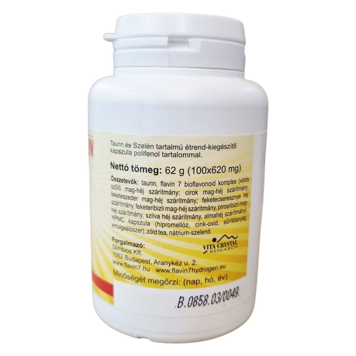 taurin, flavin 7 bioflavonoid komplex (vörös szőlő mag-héj szárítmány, cirok mag-héj szárítmány, feketeszeder mag-héj szárítmány, feketekcseresznye héj szárítmány, feketeribizli mag-héj szárítmány, pirosribizli mag-héj szárítmány, szilva héj szárítmány, almahéj szárítmány), HPMC kapszula (hipromellóz, cink-oxid, sűrítőanyag, emulgeálószer), zöld tea, nátrium-szelenit