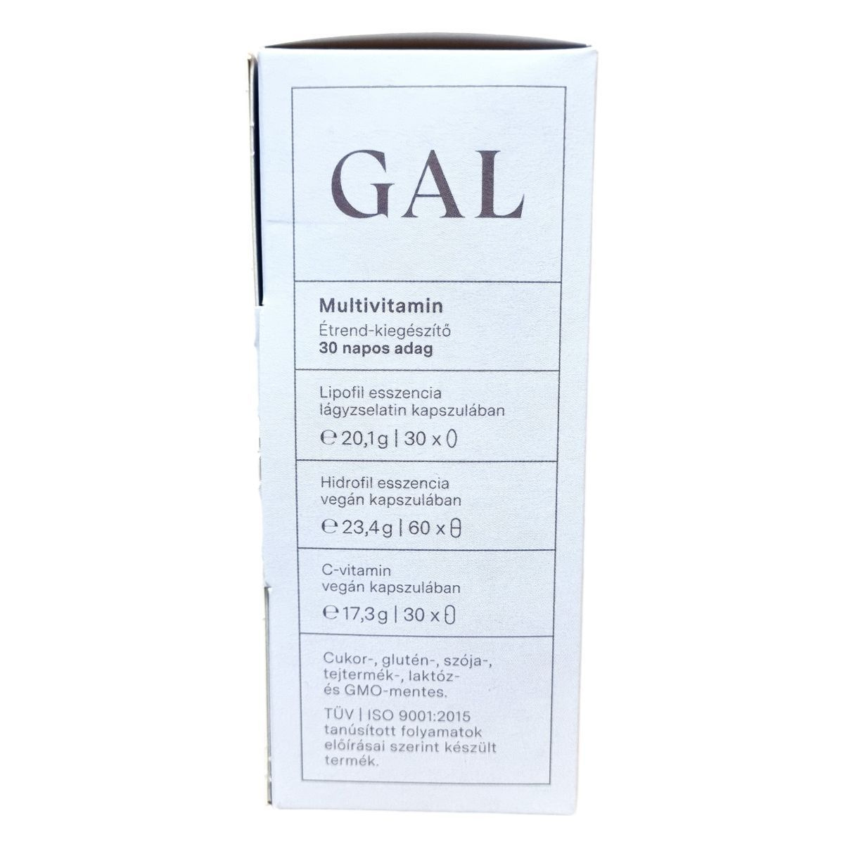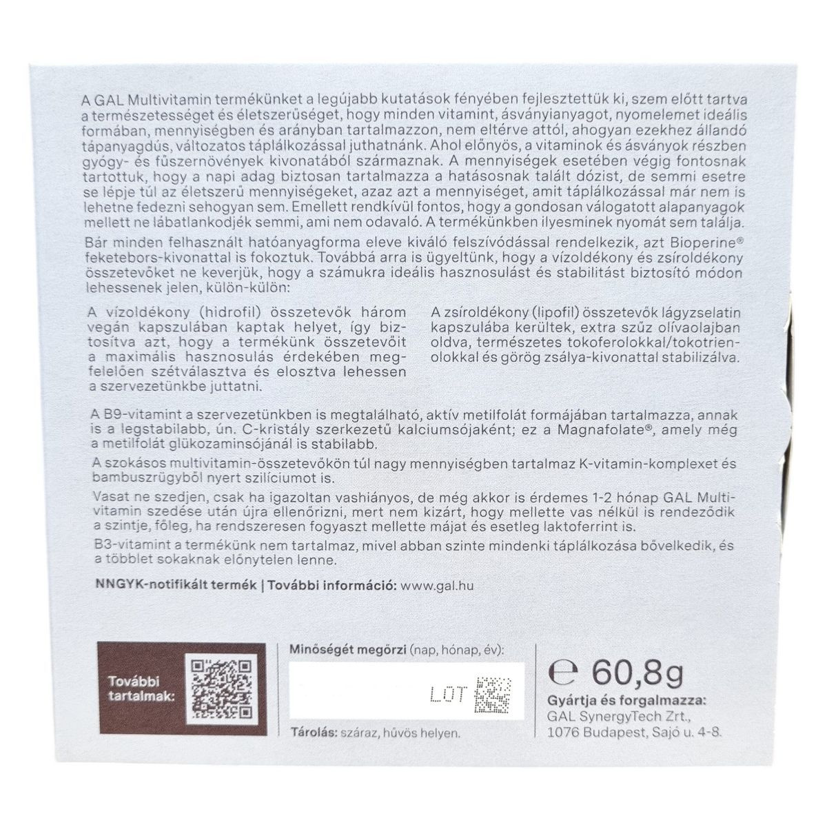 A GAL Multivitamint naprakész kutatások alapján fejlesztették ki, hogy a vitaminok, ásványi anyagok és nyomelemek természetes forrásokból, ideális mennyiségben és arányban kerüljenek a szervezetbe. A termék különlegessége, hogy a vízoldékony és zsíroldékony összetevőket külön kapszulákba helyezték a maximális hasznosulás érdekében. A lágyzselatin kapszulákban extra szűz olivaolaj és természetes antioxidánsok segítik az összetevők stabilitását, míg a három vegán kapszula biztosítja a hidrofil komponensek optimális felszívódását. A B9-vitamin aktív, stabil metilfolát formában, Magnafolate kalciumsóként szerepel a készítményben. A termék nagy mennyiségű K-vitamin-komplexet és bambuszrügyből származó szilíciumot is tartalmaz. A termék nem tartalmaz B3-vitamint, mivel azt a táplálkozás általában bőségesen biztosítja, továbbá a vállalat elkerüli a felesleges összetevőket. Ha a táplálkozás nem kielégítő bizonyos anyagokból, például magnéziumból vagy omega-3 zsírsavakból, akkor javasolt a termék kiegészítése más GAL termékekkel. A termék feldolgozása a TÜV és ISO 9001:2015 szabványok szerinti minősített folyamatokra épül, és mentes minden nem kívánatos adalékanyaggal szemben.