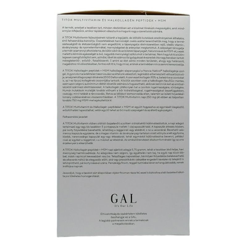 A GAL TITOK Halkollagén peptidek + MSM halkollagén-alapanyagául a francia Naticol® halkollagénje szolgál. A gyors és maradéktalan hasznosulást az általunk választott, leginkább előemésztett változat biztosítja, amelynek átlagos peptidmérete 2000 Dalton alatti. A szervezeti kollagén 95%-a, beleértve a csontokat is, az I-es típusú kollagének csoportjába tartozik. Közülük azonban csak a halkollagén Neu5Gc-mentes, ezért azon szigorú autoimmun diétát követők számára is fogyasztható, akiknek kerülniük kell az emlősállatoktól származó élelmiszereket. A halkollagén jótékonyan hat a csontok rugalmasságára, sűrűségére. Humán kutatások mutatják további előnyeit a bőr hidratáltságával, rugalmasságával összefüggésben, csakúgy, mint hatását a ráncosodás, illetve az időskori izomsorvadás ellen, valamint az ízületi folyadékállomány csökkenésének visszaszorításában. A TITOK Multivitamin napi 250 mg-ját ebben az italporban további 750 mg MSM-mel egészítettük ki.