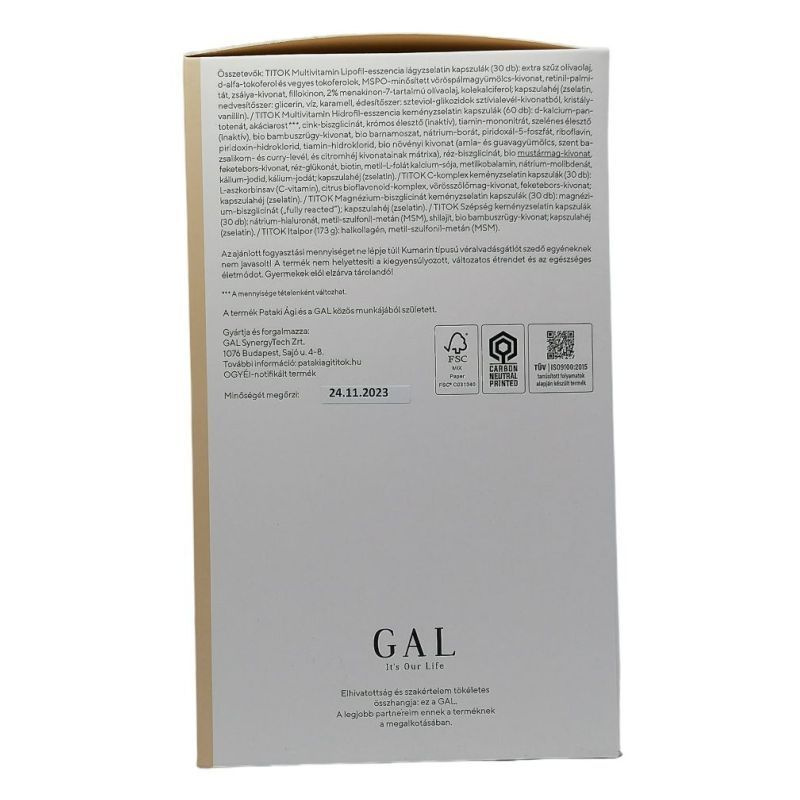 A GAL TITOK Multivitamin fejlesztésének hátterét a legújabb, de időtálló kutatások eredményeinek állhatatos, értő felhasználása biztosítja. Összetételének harmóniáját csakis azáltal teremthettük meg, hogy a természetességből és életszerűségből nem engedtünk; a tápanyagdús élelmiszerekben rejlő, ideális vitamin-, ásványianyag- és nyomelemformákat, mennyiségeket és arányokat megtartottuk. A szépséget támogatja a termék valamennyi alkotóeleme, de külön a bőr és az ízületek tápanyagait, hialuronsavat és MSM-et, s ezek mellett a körmök egészségét is óvó, nagyobb mennyiségű szilíciumot is tartalmaz. Nem hagytuk ki a különlegesen csengő shilajitot sem, az indiai, tibeti és számos ősi gyógyászat évezredek óta nagy becsben tartott méregtelenítő-, erősítő-, fiatalítószerét. S amint az élet szinte minden területén, ahogy egy határozott, magabiztos nő választásaiban, fontos volt itt is, hogy mi az, aminek a termékben nincs semmi keresnivalója.