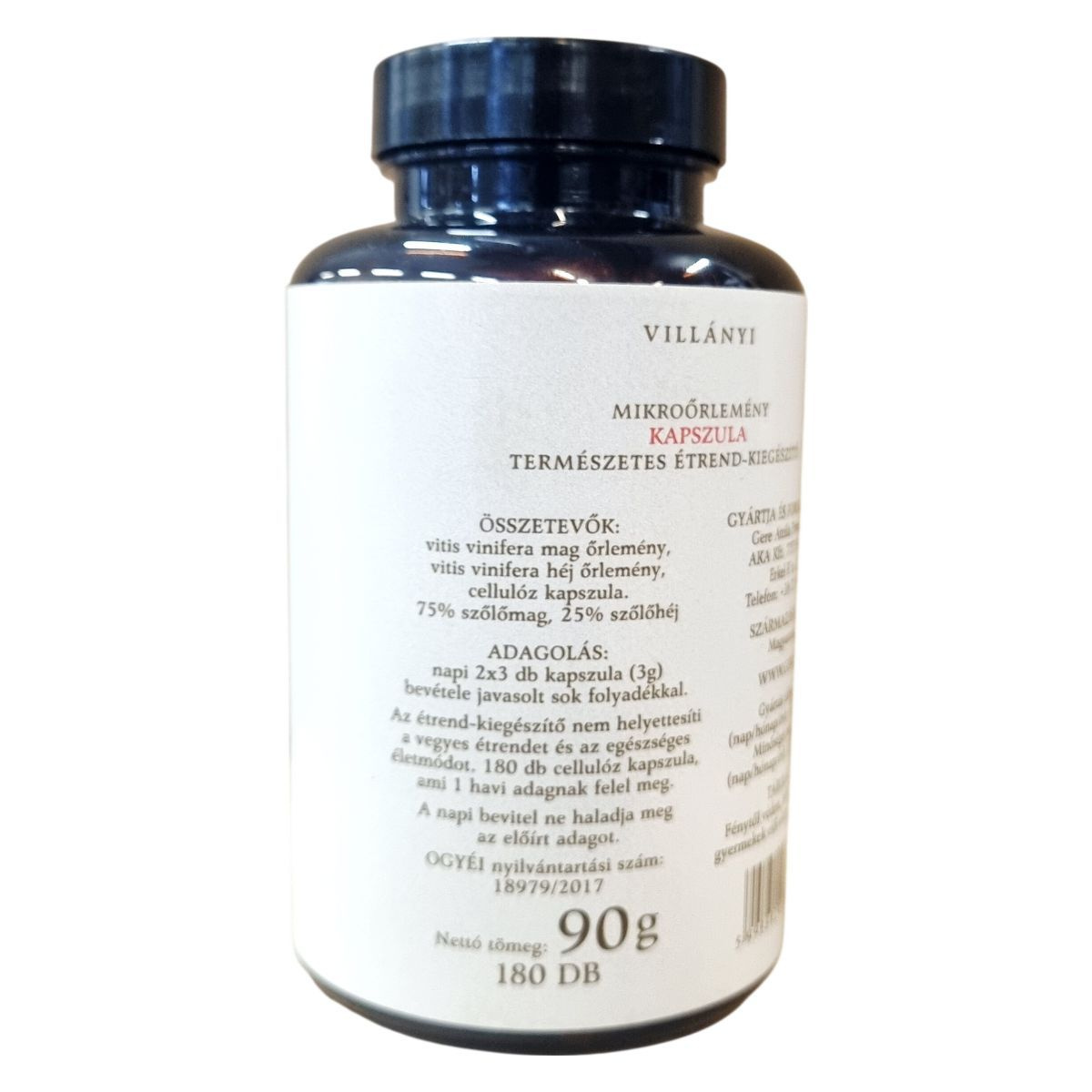 A Villányi Mikroőrlemény kapszula 180 darab cellulóz kapszulát tartalmaz, amely körülbelül egy havi adagnak felel meg. Magyarországon, Villányban készül, és kizárólag szőlőmag és szőlőhéj őrleményt tartalmaz. A termék a Villányi termőtáj esszenciáját hordozza, ezáltal a természetes összetevők támogatásával járulhat hozzá az egészséges étrendhez és életmódhoz.
