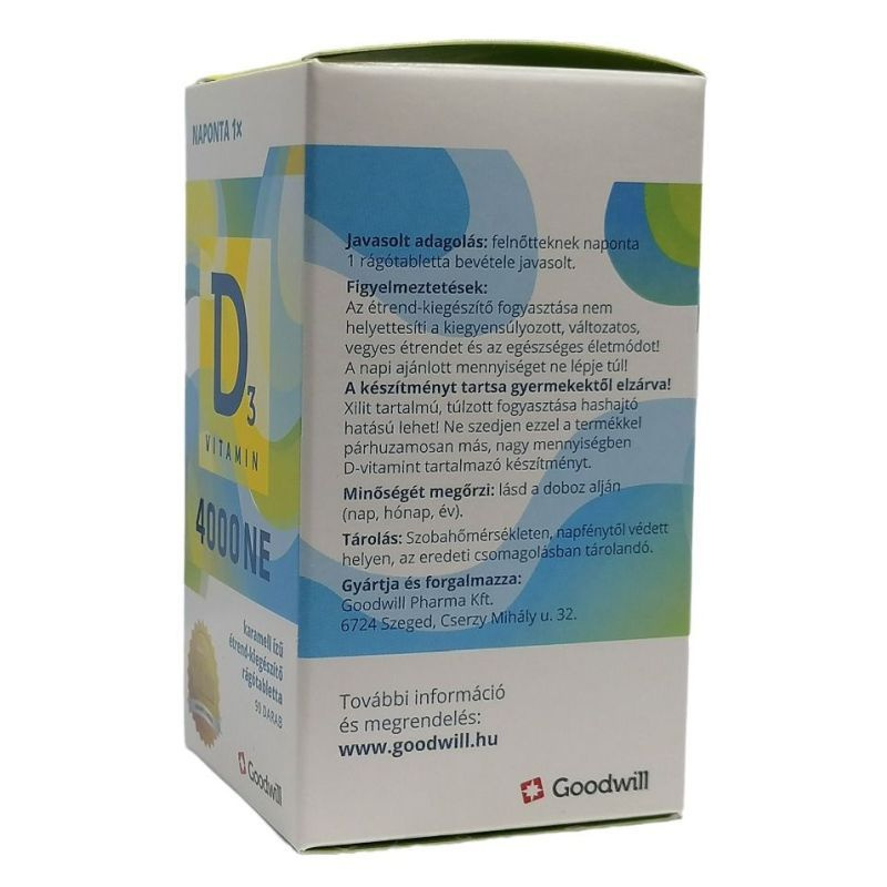 4000 NE D3-vitamin tartalmú étrend-kiegészítő rágótabletta édesítőszerrel. Napi egy tabletta támogatja az immunrendszer normál működését. D-vitamin hozzájárul az immunrendszer normál működéséhez, az egészséges csontozat és izomfunkció fenntartásához. A D-vitamin hozzájárul a vér normál kalciumszintjének fenntartásához.A D-vitamin hozzájárul a kalcium és a foszfor normál felszívódásához, az egészséges csontozat és izomfunkció, a normál fogazat fenntartásához.