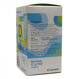 Nagydózisú, 4000NE D3-vitamint tartalmazó étrend-kiegészítő rágótabletta édesítőszerrel. 3 havi adag!