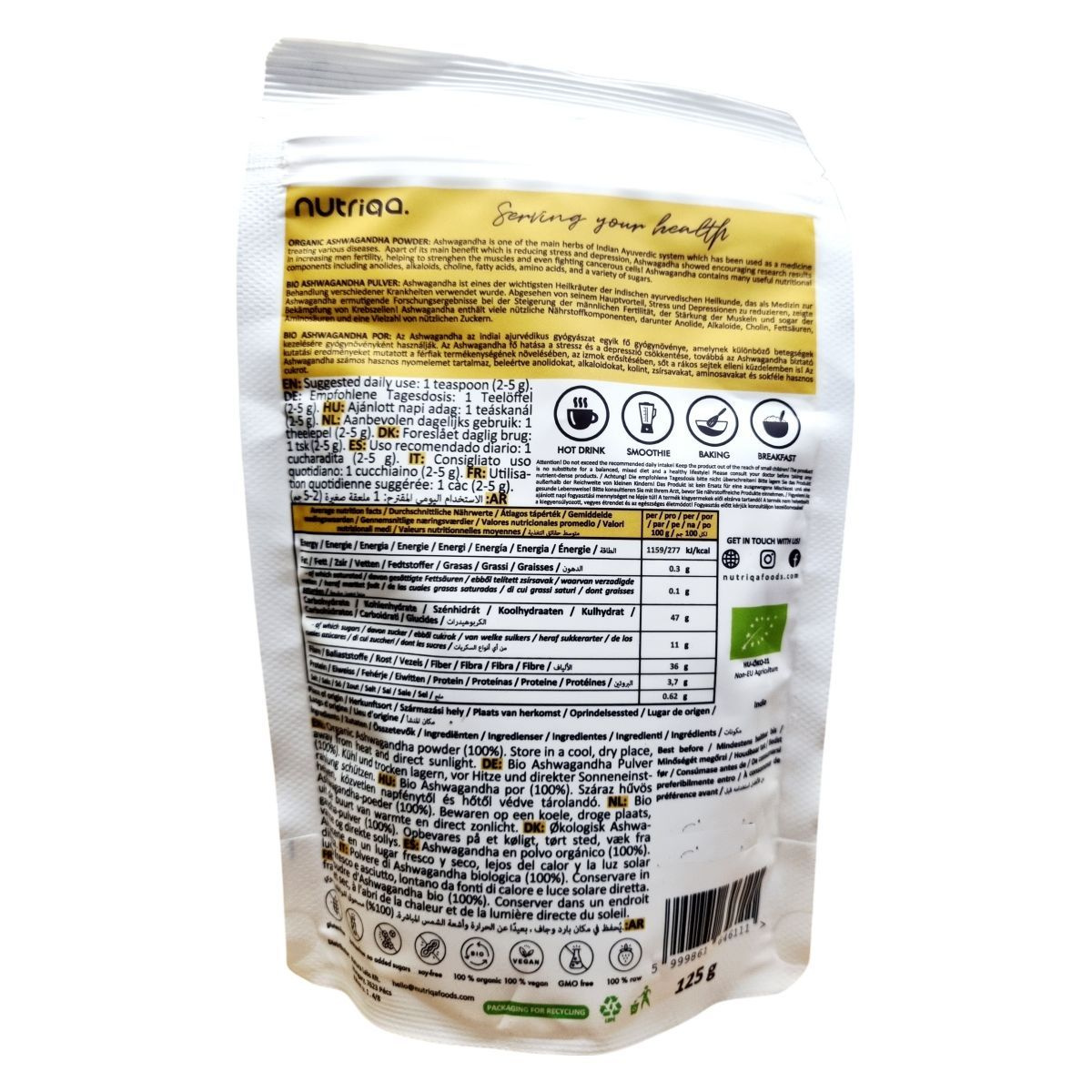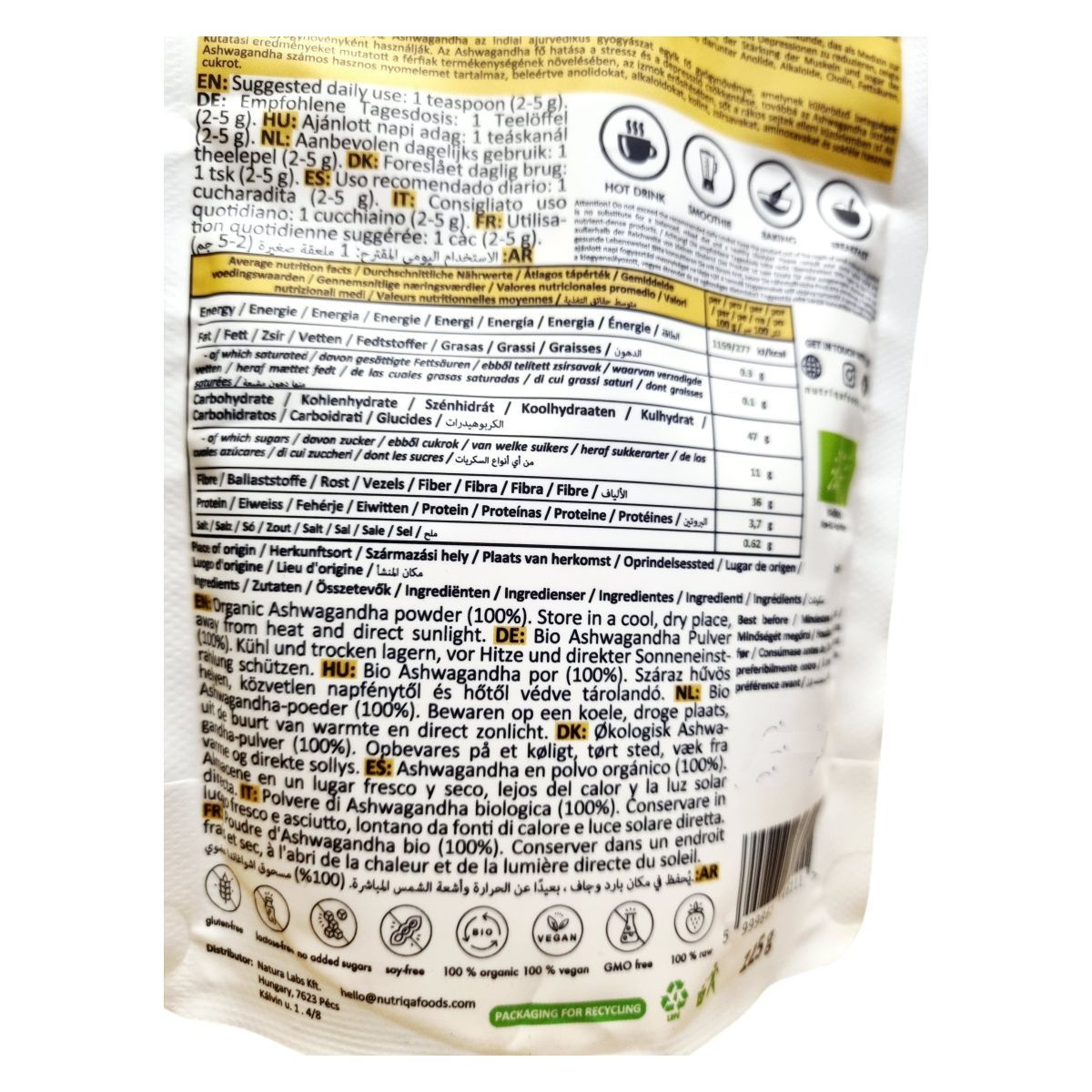 Az Organic Ashwagandha Powder a nutriqa márkától egy 100% bio, vegán, raw és ayurvédikus étrend-kiegészítő, amely az indiai ayurvédikus gyógyászat egyik fő gyógynövényét, az Ashwagandhát tartalmazza. Az Ashwagandha számos hasznos nyomelemet tartalmaz, mint például anolidokat, alkaloidokat, kolint, zsírsavakat, aminosavakat és különféle cukrokat. A termék GMO-mentes, gluténmentes, laktózmentes, szójamentes, és nem tartalmaz hozzáadott cukrot. Az Ashwagandha hozzájárulhat a stressz és a depresszió csökkentéséhez, valamint támogathatja a férfiak termékenységét, az izmok erősítését és a rákos sejtek elleni küzdelmet. Az ajánlott napi adag 1 teáskanál (2-5 g), amelyet különböző formákban, például forró italokban, turmixokban, sütéshez vagy reggelihez lehet felhasználni.
