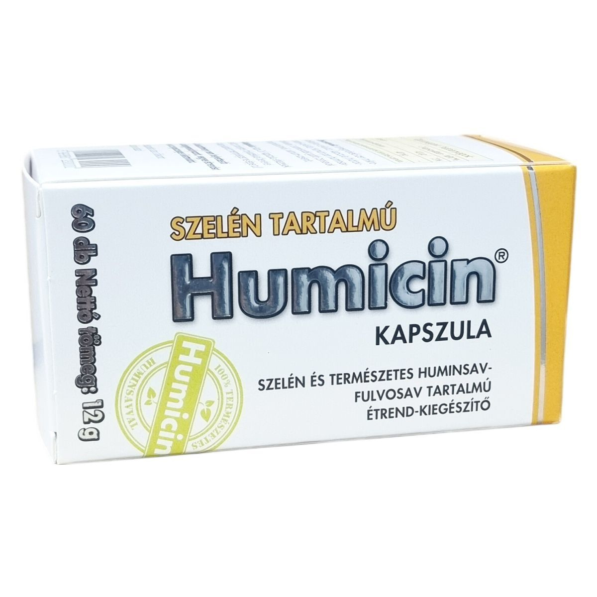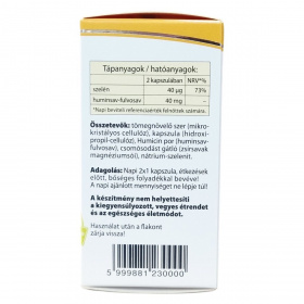 A Humicin® Szelén tartalmú kapszula egy természetes összetevőkből álló étrend-kiegészítő, amely szelént és huminsav-fulvosavat tartalmaz. A szelén hozzájárulhat az immunrendszer normál működéséhez, a sejtek oxidatív stresszel szembeni védelméhez, valamint a pajzsmirigy normál működéséhez, továbbá részt vehet a normál spermaképződés folyamatában. A terméket különösen kiegyensúlyozatlan táplálkozás vagy szigorú diéta esetén javasolt használni. A kapszula 60 darabos kiszerelésben érhető el és napi két alkalommal ajánlott szedni étkezések előtt, bőséges folyadékkal. A termék nem helyettesíti a változatos étrendet és az egészséges életmódot. Tárolását száraz, hűvös és fényvédett helyen kell biztosítani, valamint kerülni kell, hogy gyermekek hozzáférhessenek. A kapszula összetevői között szerepel mikrokristályos cellulóz, hidroxipropil-cellulóz alapú kapszula, Humicin por (huminsav-fulvosav), csomósodást gátló zsírsavak magnéziumsói és nátrium-szelenit.