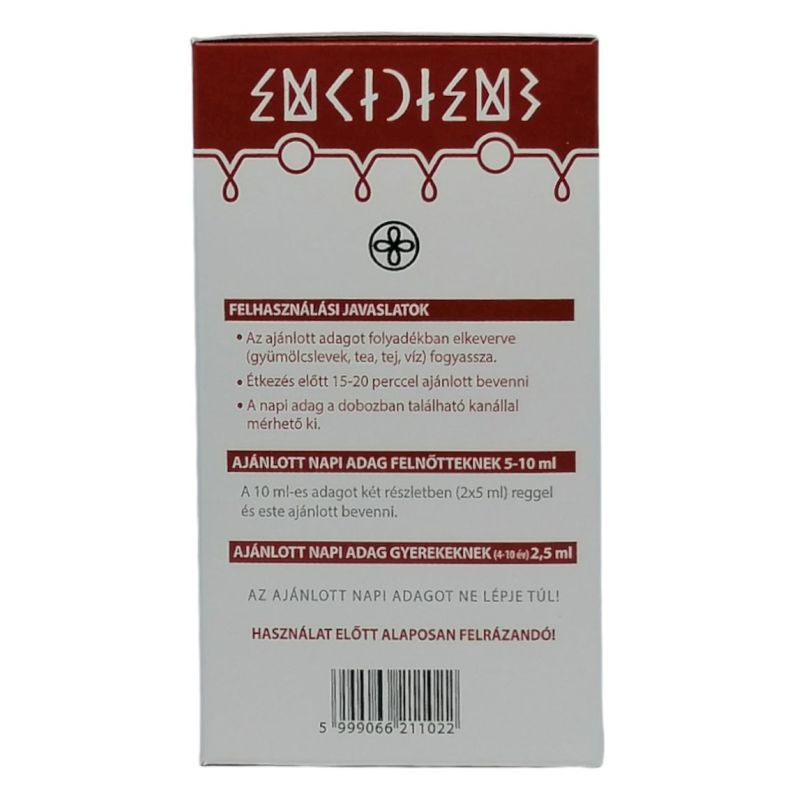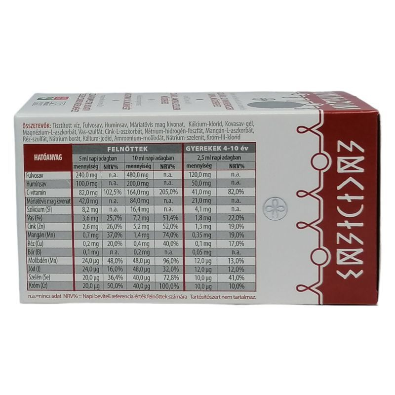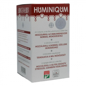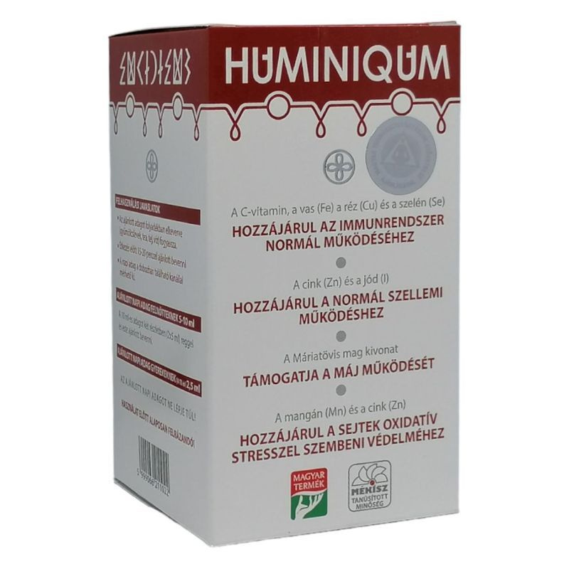 A Huminiqum étrend-kiegészítő szirup a szervezet számára szükséges mikroelemeket, huminsav és fulvosav komplexek formájában tartalmazza természetes arányban. A készítmény hatóanyagát világviszonylatban is egyedülálló, Magyarországi természetes humusz ásványból (leonardite) vonjuk ki. A Huminiqum étrend-kiegészítő szirup főbb jellemzői. Antioxidáns. Enzimaktivitás növelése. Antivirális. Szerves kelátképző. Az ásványi anyagok felvételét optimalizálja. Megköti a toxinokat. A sav-bázis egyensúlyt helyreállítja. Adagolás: Általános roborálásra 1x2-3 ml. Mikroelem hiányos tünetek kezelésére 1x4 ml. Fáradtság, levertség érzet esetén 1x5 ml. Fizikai megterhelés, versenyzés 2x3 ml. Szellemi kimerültség esetén 2x4 ml. Vérszegénységi tünetek, menstruáció 2x3 ml. Áldott állapotban, szoptatós anyáknak 1x2-4 ml. Betegség utáni lábadozás 2x3 ml. Gyermekeknek a napi adag fele javasolt. Reggel étkezés előtt, illetve este étkezés után 15-20 perccel ajánlott bevenni, egy pohár folyadékban (víz, tej, joghurt, gyümölcslé) elkeverve. Ízét kellemesebbé tehetjük és hatását fokozhatjuk, ha 1-2 csepp citromlevet adunk hozzá. A készítmény nem tartalmaz semmilyen adalékanyagot. Összetétel: Huminsav, Fulvosav, Vas-szulfát, Cink-szulfát, Mangán-szulfát, Réz-szulfát, Ammonium-molibdenát, Nátrium-hidrogén-foszfát, Nátrium-jodid, Króm-klorid, Nátrium-szelenit, Kobalt-klorid, desztilált víz.