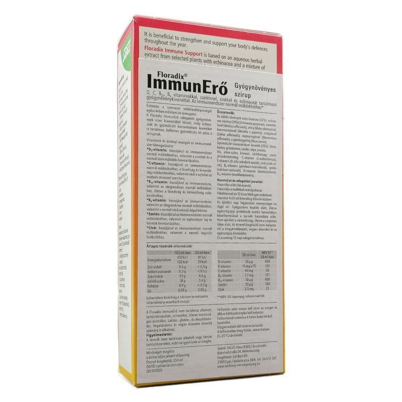 Összetevők: Az alábbi növények vizes kivonata (52%): echinacea növény (24%) (Echinacea purpurea), citromfűlevél (Melissa officinalis), alma (Malus domestica), borsmentalevél (Mentha x piperita), zsályalevél (Salvia officinalis), rozmaringlevél (Rosmarinus officinalis), csipkebogyóhéj (Rosa canina), Gyümölcslé koncentrátum keverék (35%): körte, bodza, gránátalma, szeder, répa, acerola, Víz, alma-szilva kivonat, sűrítőanyag: szentjánoskenyérmag, C-vitamin (L-aszkorbinsav), E-vitamin (D-alfa-tokoferil-acetát), cink (cink-citrát), B6-vitamin (piridoxin-hidroklorid), szelén (nátrium-szelenát), D-vitamin (kolekalciferol), B12-vitamin (metilkobalamin).