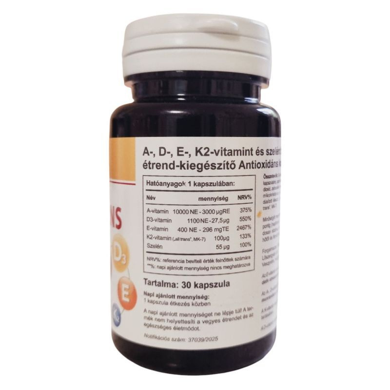 Ez az étrend-kiegészítő kapszula A-, D-, E-, K2-vitaminokat és szelént tartalmaz, amelyek egymást kiegészítő hatással támogatják a szervezetet, hozzájárulhat a sejtek oxidatív stresszel szembeni védelméhez.