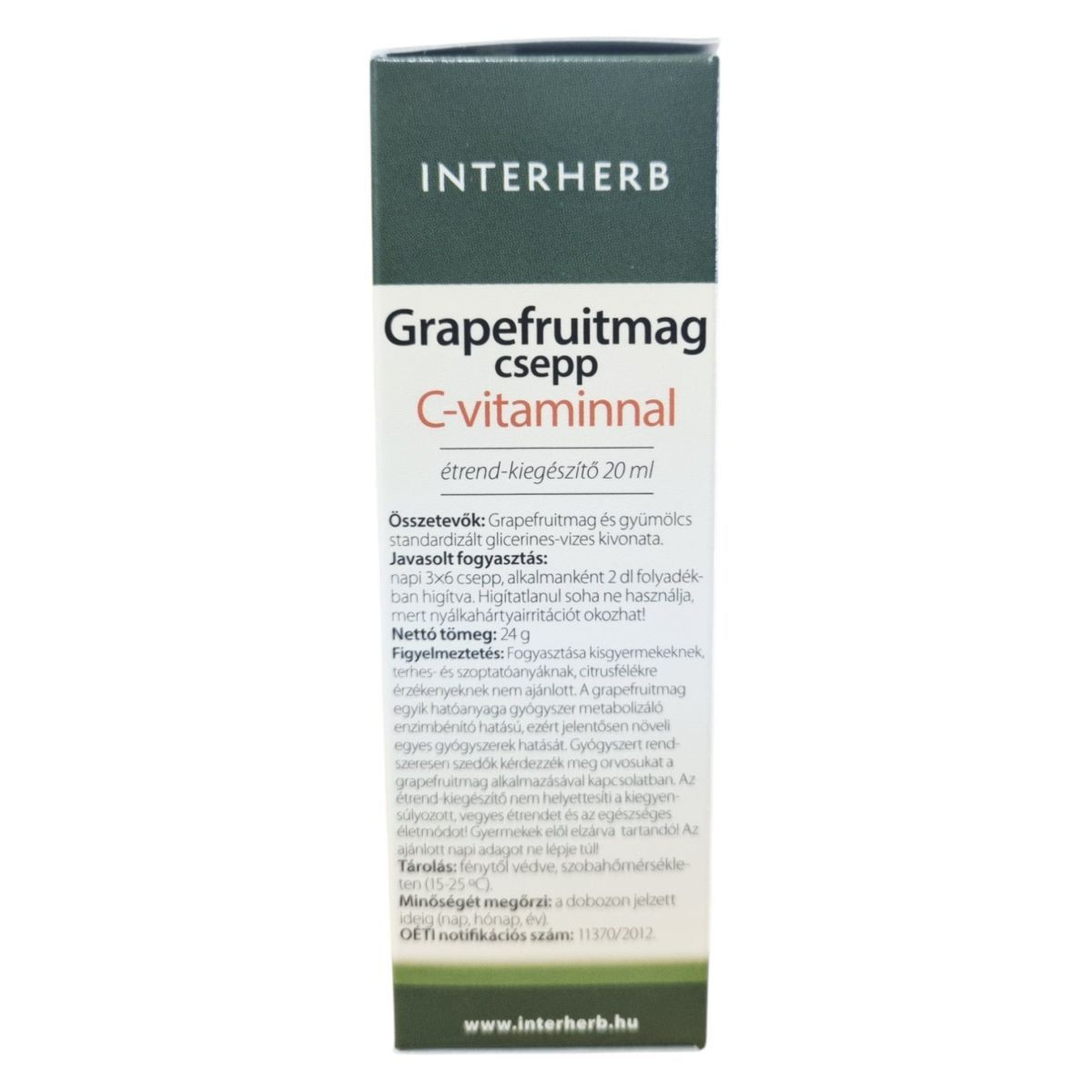 Az INTERHERB Grapefruitmag csepp C-vitaminnal egy 20 ml-es étrend-kiegészítő, amely grapefruitmag és gyümölcs standardizált glicerines-vizes kivonatát tartalmazza. A termék antioxidáns hatású bioaktív anyagokat, például citrus bioflavonoidokat és C-vitamint tartalmazhat, amelyek hozzájárulhatnak az immunrendszer egészséges működéséhez és a sejtek védelméhez. A termék fogyasztása kisgyermekeknek, terhes- és szoptató anyáknak, valamint citrusfélékre érzékenyeknek nem ajánlott. A grapefruitmag hatóanyagai befolyásolhatják egyes gyógyszerek hatását, ezért fontos az orvossal való konzultáció. A terméket jól lezárt üvegben, szobahőmérsékleten kell tárolni.