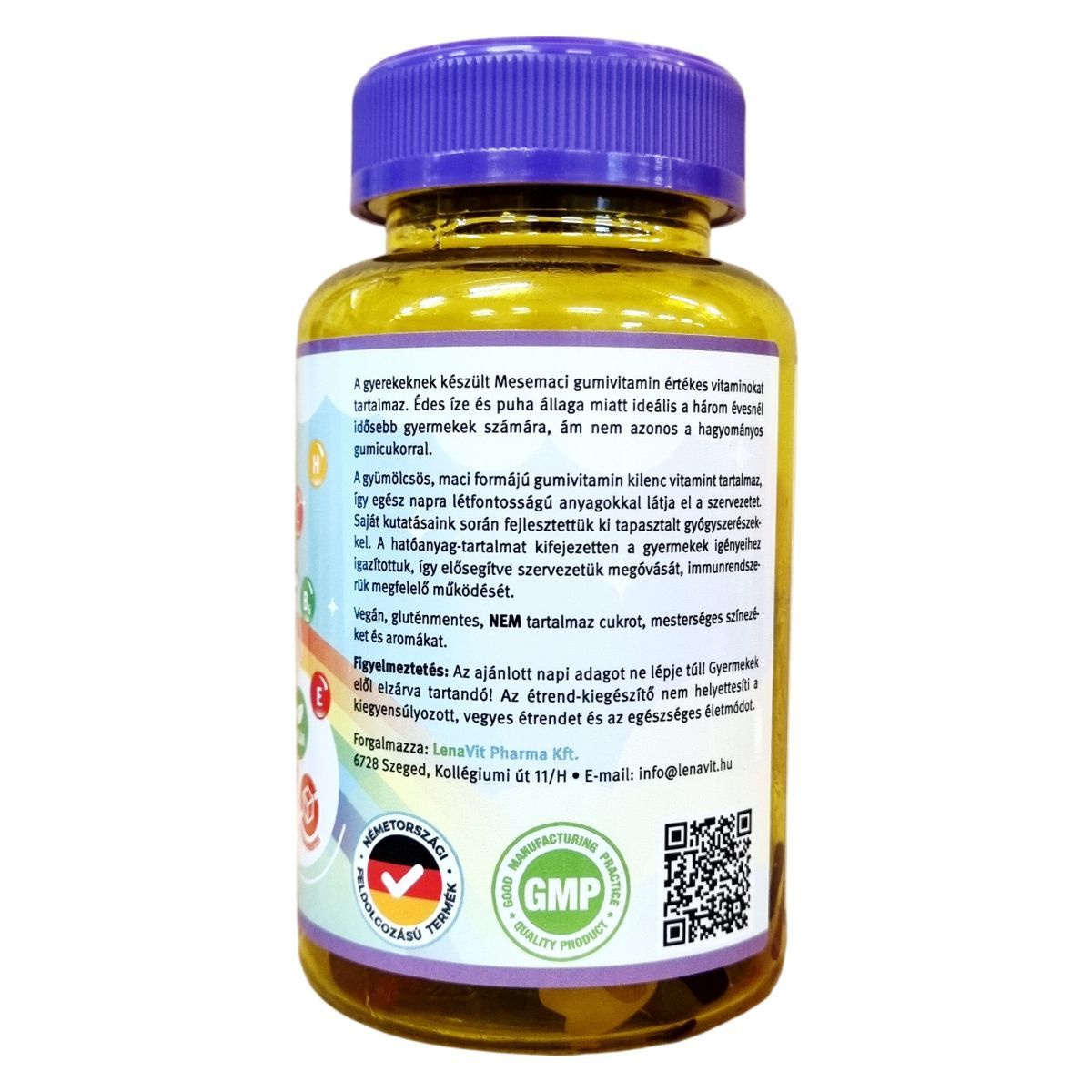 A gyerekeknek készült Mesemaci gumivitamin értékes vitaminokat tartalmaz. Édes íze és puha állaga miatt ideális a három évesnél idősebb gyermekek számára, ám nem azonos a hagyományos gumicukorral. A gyümölcsös, maci formájú gumivitamin kilenc vitamint tartalmaz, melyek egész napra létfontosságú anyagokkal láthatják el a szervezetet. A termék saját kutatások alapján, tapasztalt gyógyszerészekkel fejlesztett hatóanyag-tartalommal készül, mely kifejezetten a gyermekek igényeihez igazodik, ezzel elősegítve szervezetük megóvását és immunrendszerük megfelelő működését. A termék vegán, gluténmentes, nem tartalmaz cukrot, mesterséges színezékeket vagy aromákat. Németországi feldolgozású, GMP minőségű készítmény.