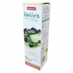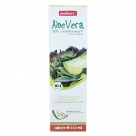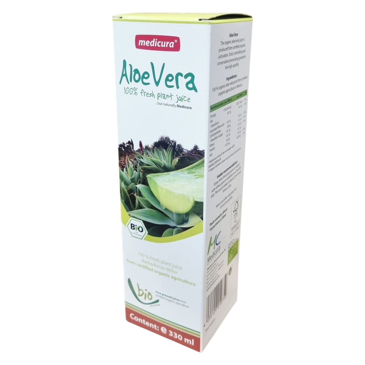 A Medicura Aloe Vera 100%-ban friss növényi lé formájában kínált termék, amely Barbadensis Miller aloe verából készül ellenőrzött biológiai termesztésből, elsősorban Mexikóból származó alapanyagból. A gyártás során szigorú minőségellenőrzést és kíméletes feldolgozást alkalmaznak a magas minőség biztosítása érdekében. A termék fő összetevője a 99,8%-os aloe vera lé. A csomagolás környezetbarát FSC tanúsítvánnyal rendelkező, vegyes forrásból származó anyagokból készül, amely elősegítheti a fenntartható erdőgazdálkodást. Az ajánlott napi adag háromszor 20 ml, amely önmagában vagy más italokhoz keverve fogyasztható. A termék tárolásánál fontos betartani a hűtést felbontás után, valamint a gyors fogyasztást a minőség megőrzése érdekében. A termék kizárólag biológiai gazdálkodásból származó összetevők felhasználásával készül, és a német-biológiai szabványoknak megfelelő engedélyekkel rendelkezik, melyeket a megfelelő hatóságok ellenőriznek és tanúsítanak.