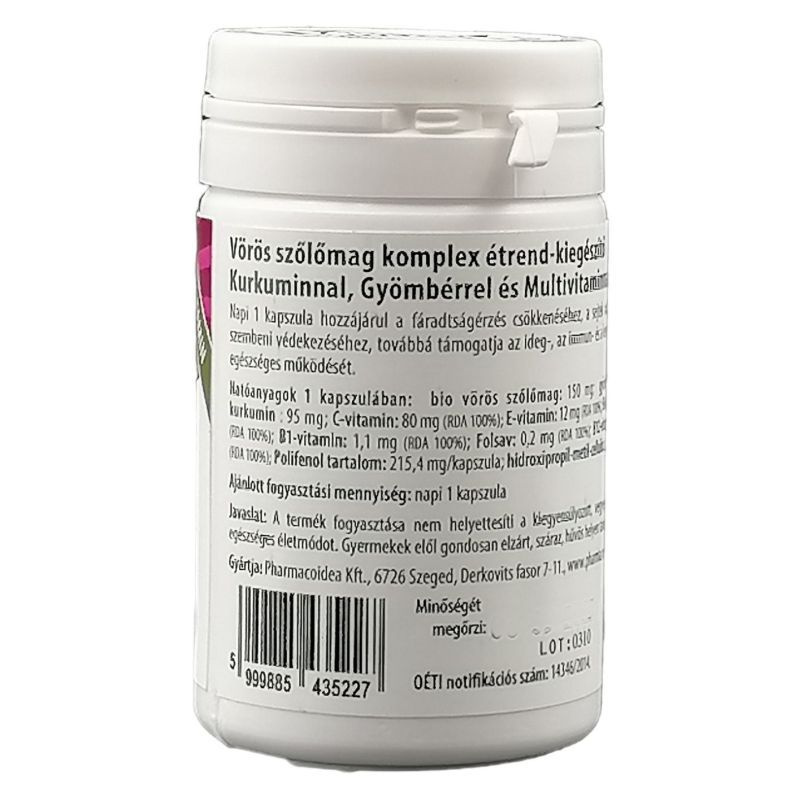 A kapszula hatóanyagai részt vesznek az immunrendszer normál működésében, a kurkuma és a vitaminok ezen felül támogatják az idegrendszer egészséges működését is. A vörös szőlő magja az egészségre számos jótékony hatással bíró polifenolok egyik leggazdagabb természetes forrása, melynek köszönhetően a szőlőmag fogyasztása segíti az idegrendszer működését. Vörös szőlőmag étrend-kiegészítő kurkuma kivonattal, gyömbérrel és vitaminokkal, magas polifenol tartalommal. 30 kapszula. 500mg/kapszula.