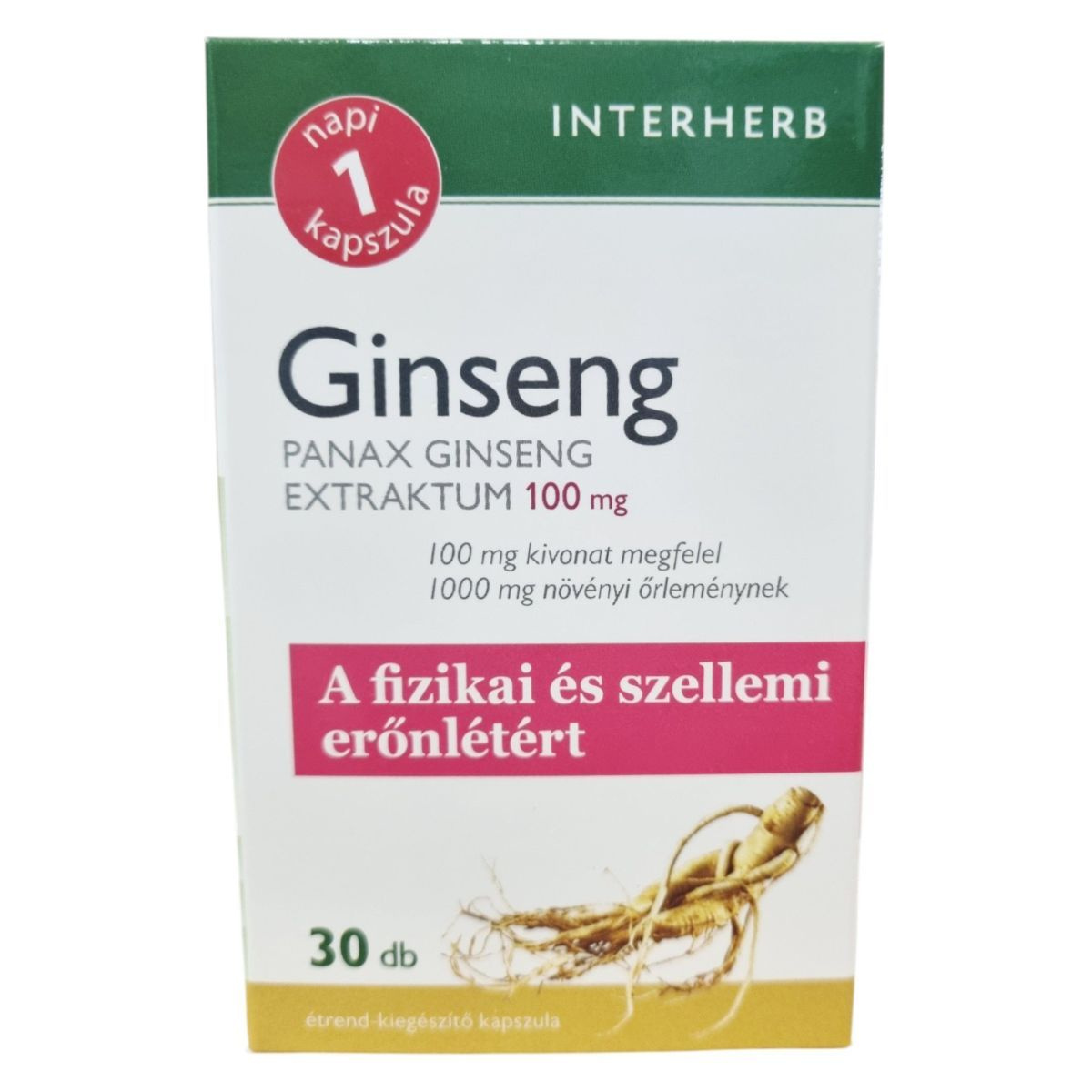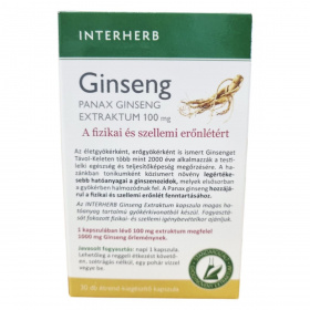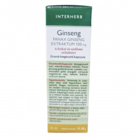Az INTERHERB Ginseng PANAX GINSENG EXTRAKTUM 100 mg kapszula a fizikai és szellemi erőnlét támogatására szolgálhat. A termék standardizált ginszenoid hatóanyag tartalommal rendelkezik, amely a Panax ginseng gyökérkivonatának köszönhetően segíthet a testi-lelki egészség megőrzésében. A Távol-Keleten több mint 2000 éve alkalmazott ginseng hozzájárulhat a teljesítőképesség fenntartásához. A kapszula fogyasztását fokozott fizikai- és szellemi igénybevétel esetén ajánlják. A termék megbízható minőségét a koncentrált extraktum, bevizsgált alapanyag és hazai fejlesztés garantálja.