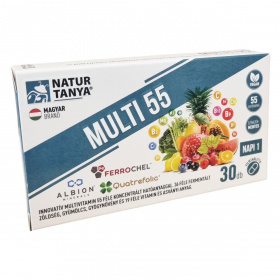 A Natur Tanya® MULTI 55 filmtabletta egy laboratóriumban bevizsgált, glutén- és laktózmentes készítmény, amely 55 féle koncentrált hatóanyagot tartalmaz. Ezek között szerepelnek fermentált és liofilizált zöldség-, gyümölcs- és gyógynövényporok, valamint 19 féle vitamin és ásványi anyag, mint például A-vitamin, vegán forrásból származó D3-vitamin, E- és K2-vitamin, továbbá B-vitamin komplex, magnézium, vas, cink, réz, mangán és króm. A termék nem tartalmaz mesterséges tartósítószert, színezéket és aromát. A filmtabletták színezékmentesek, és egy filmtabletta napi adagja. A termék hozzájárulhat a vegán étrend követéséhez, és előállítása 100%-ban magyar tulajdonú cég munkáját támogatja.